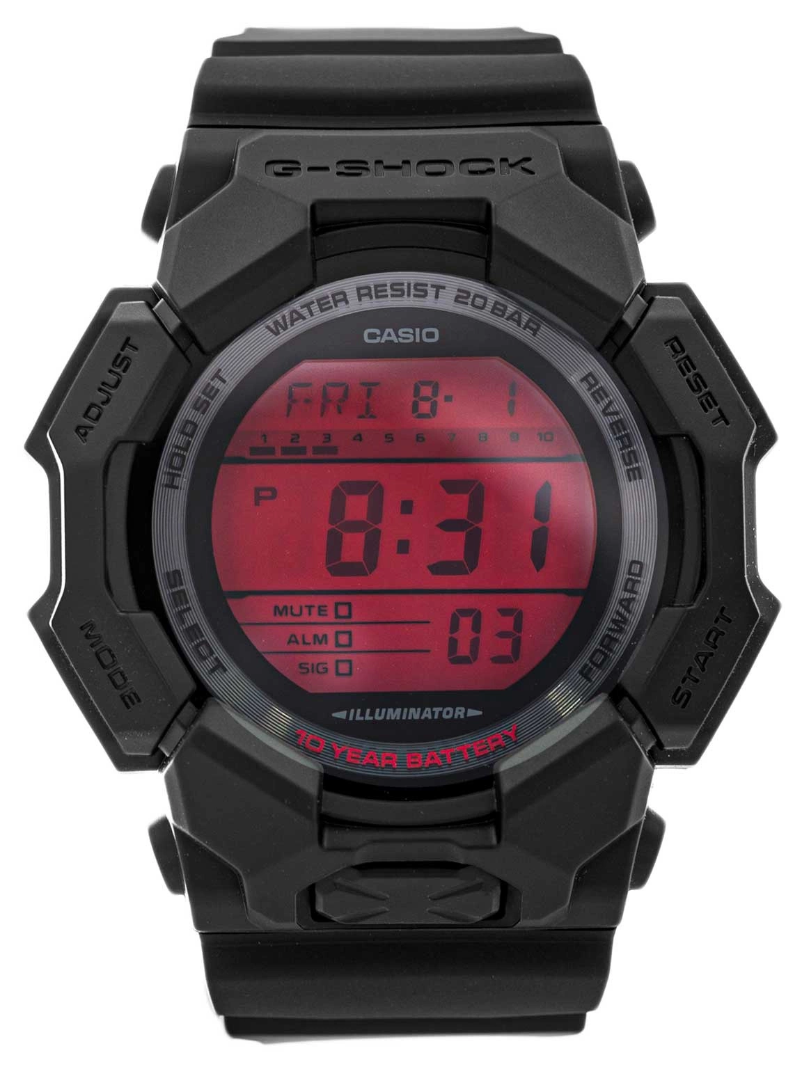 We wnętrzu czasomierza pracuje precyzyjny mechanizm kwarcowy, zasilany baterią o imponującej żywotności sięgającej nawet dziesięciu lat, co czyni model wyjątkowo bezobsługowym. Szkiełko mineralne chroni ekran przed zarysowaniami, a system wstrząsoodporny G‑Shock zabezpiecza mechanizm przed skutkami upadków i uderzeń. Klasa wodoszczelności 20 BAR pozwala na swobodne korzystanie z zegarka w trakcie aktywności związanych z wodą, bez obaw o uszkodzenie konstrukcji. Funkcjonalność GD‑010BBR‑1ER obejmuje szeroki wachlarz praktycznych rozwiązań. Czas światowy umożliwia sprawdzenie godziny w wybranych strefach na całym świecie, a precyzyjny stoper i timer wspierają zarówno trening, jak i codzienne zadania wymagające odmierzania czasu. Pięć niezależnych alarmów dziennych pozwala zaplanować dzień z maksymalną dokładnością, a funkcja SIG informuje dźwiękowym sygnałem o każdej pełnej godzinie. Istnieje także możliwość wyciszenia odgłosów przycisków, przy zachowaniu działania alarmów i sygnałów czasowych. Wbudowany kalendarz automatyczny pamięta o krótszych miesiącach i latach przestępnych, a przełączanie między formatem 12‑ i 24‑godzinnym pozwala dopasować sposób prezentacji czasu do indywidualnych preferencji.