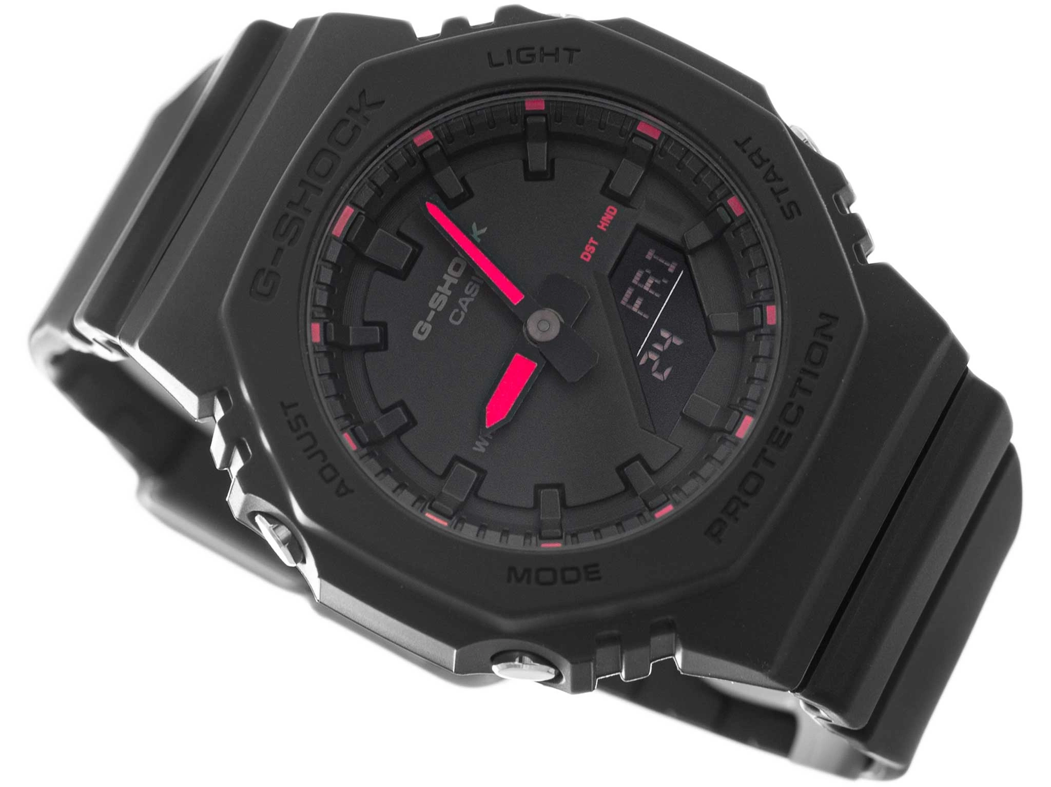 CASIO G-SHOCK GMA-P2100SA-1A1 to damski zegarek sportowy, który łączy nowoczesny design z niezawodną funkcjonalnością, idealny dla kobiet prowadzących aktywny tryb życia. Smukła i lekka konstrukcja w głębokiej czerni z czerwonymi detalami przyciąga wzrok i doskonale dopasowuje się do kobiecego nadgarstka, oferując komfort noszenia przez cały dzień. Wyposażony w precyzyjny mechanizm kwarcowy made in Japan, gwarantuje dokładny pomiar czasu w każdej sytuacji, a wytrzymała obudowa z tworzywa sztucznego oraz mineralne szkło zapewniają ochronę przed wstrząsami, zarysowaniami i innymi uszkodzeniami mechanicznymi.