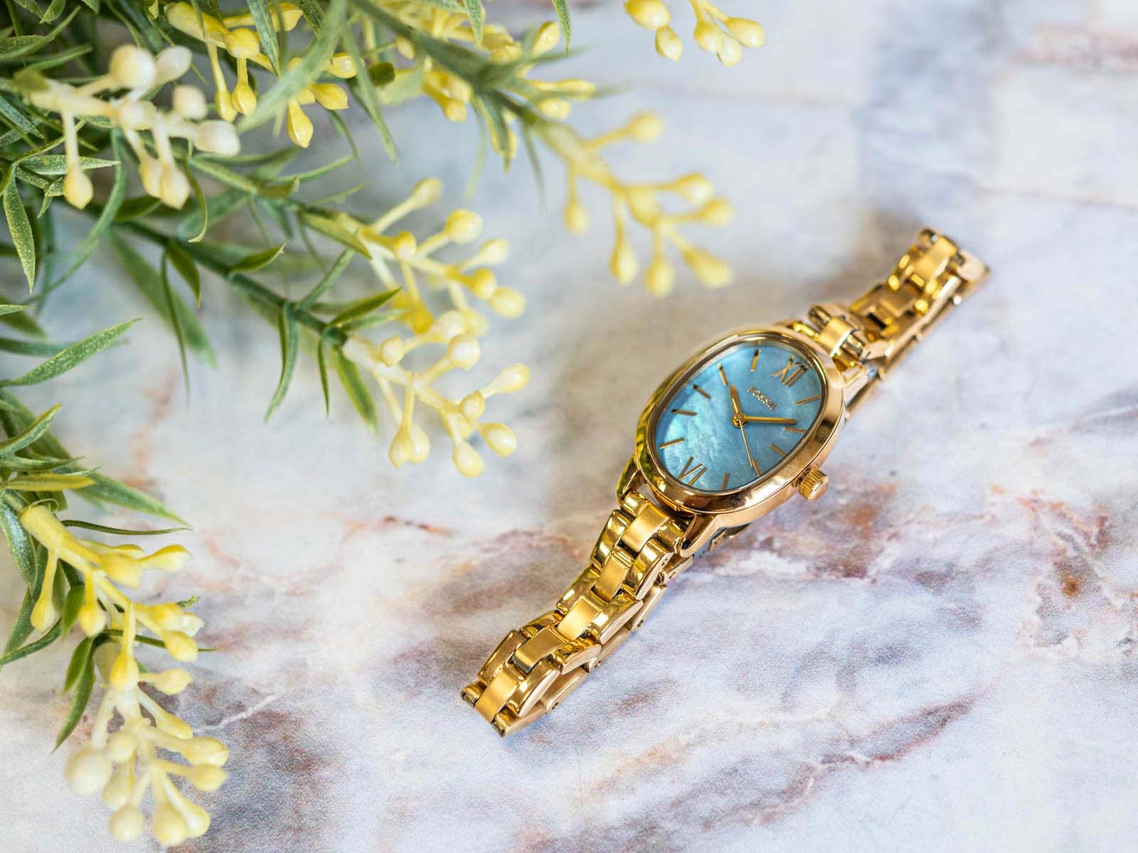 Centralnym punktem zegarka jest efektowna, niebieska tarcza z delikatnym, perłowym połyskiem. W zależności od kąta padania światła mieni się ona różnymi odcieniami, tworząc wyjątkowy i kobiecy efekt. Złote, rzymskie indeksy oraz smukłe wskazówki dodają całości wyrafinowanego charakteru, podkreślając dbałość o detale. Mineralne szkiełko skutecznie chroni tarczę przed zarysowaniami i uszkodzeniami, a eleganckie metalowe pudełko, w które zapakowany jest zegarek, doskonale sprawdzi się jako prezent lub stylowe etui do przechowywania. Fossil BQ5031 to idealny wybór dla kobiet, które cenią sobie dyskretną elegancję, wysoką jakość wykonania i funkcjonalność. To nie tylko dodatek, ale również wyraz osobistego stylu i klasy.