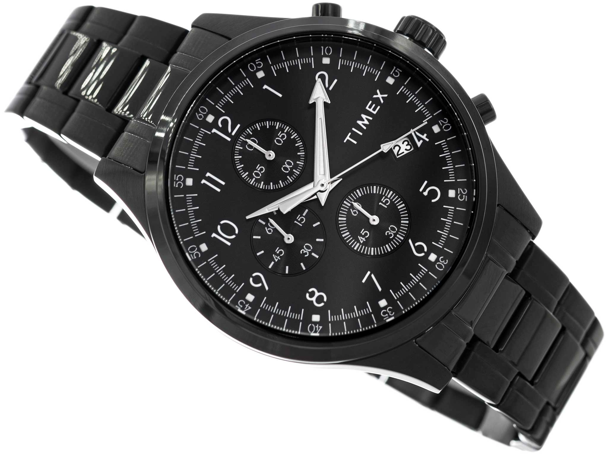 - Zegarek Męski Timex TW2Y01600 czarny na bransolecie, posiada funkcje takie jak chronograf, datownik i neobrite.