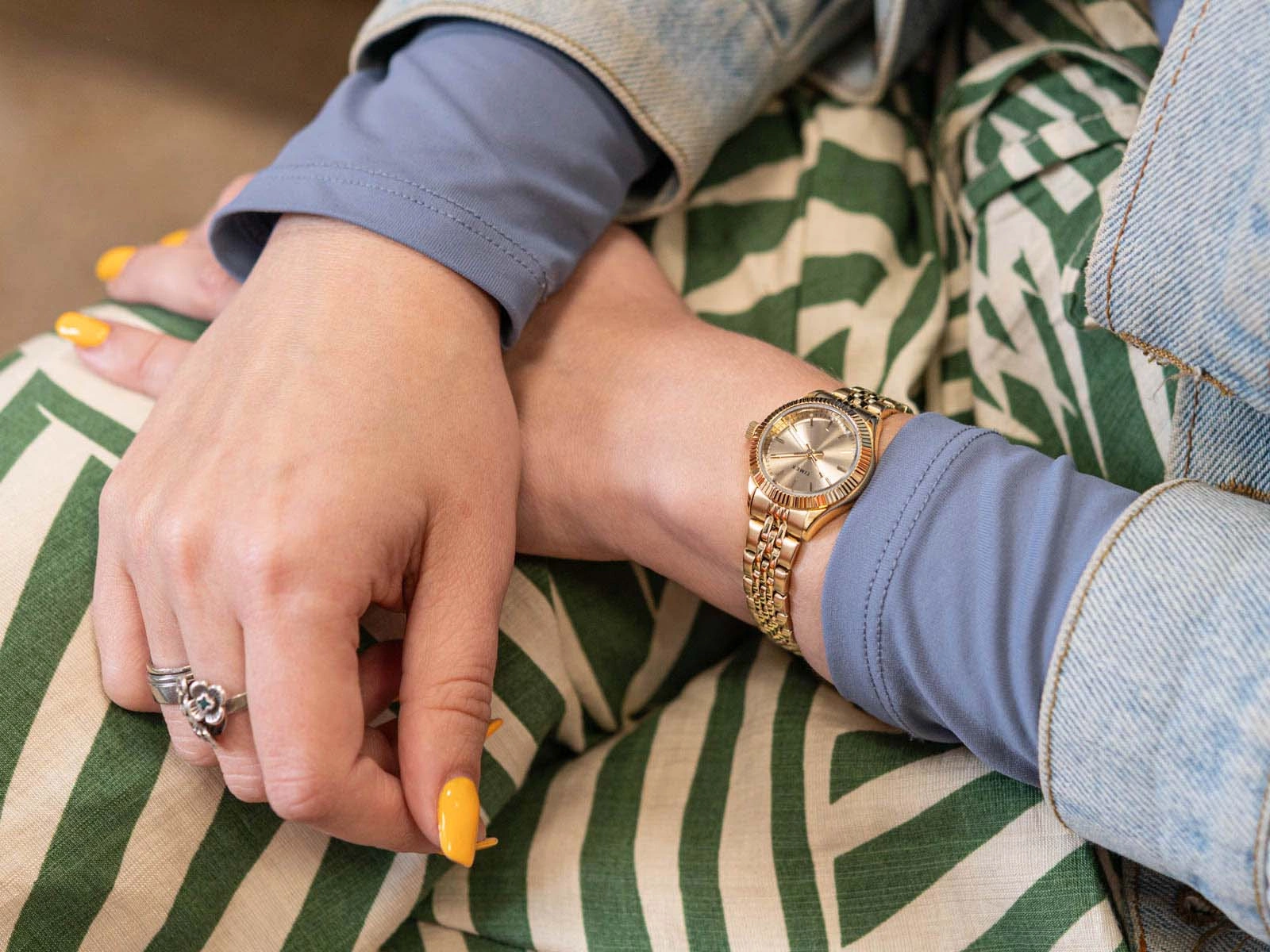 Timex TW2W91000 Legacy Mini to zegarek, w którym klasyczna elegancja zyskuje pełnię blasku dzięki spójnej, złotej tonacji. Niewielka, smukła koperta wykonana z metalu harmonijnie przechodzi w dopasowaną bransoletę o delikatnym splocie, tworząc jednolitą, biżuteryjną formę. Złota tarcza, subtelnie ozdobiona szlifem słonecznym, emanuje ciepłym, luksusowym blaskiem, a jej przejrzystą kompozycję podkreślają smukłe wskazówki i dyskretne indeksy. Elementy pokryte fosforyzującą powłoką neobrite po wcześniejszym naświetleniu zapewniają wygodny odczyt czasu po zmroku, a precyzyjny mechanizm kwarcowy, zasilany wymienną baterią, gwarantuje niezawodność w codziennym użytkowaniu. Cyferblat zabezpiecza szkiełko mineralne. Całość utrzymana w jednolitej kolorystyce stanowi wyrafinowany dodatek, który z równą swobodą uzupełni wieczorową kreację, jak i elegancki strój codzienny.