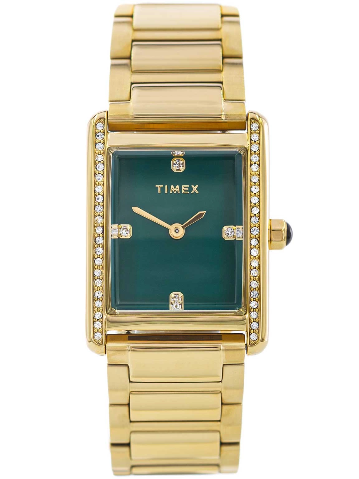 Timex TW2W87500 Hailey to zegarek, w którym klasyczne inspiracje spotykają się z olśniewającą formą. Smukła koperta w ciepłym odcieniu złota została subtelnie wyprofilowana i ozdobiona dwoma rzędami drobnych, lśniących kryształków, które nadają kompozycji biżuteryjnego charakteru. Złota bransoleta o wyraźnej, retro stylistyce harmonijnie współgra z całością, tworząc elegancką, spójną linię. Centralnym punktem projektu jest głęboka, zielona tarcza o gładkim, satynowym wykończeniu, na której cztery główne punkty godzinowe – 12, 3, 6 i 9 – wyznaczają połyskujące cyrkonie. Mineralne szkło chroni tarczę, zachowując jej nieskazitelny wygląd na długo. We wnętrzu koperty pracuje precyzyjny mechanizm kwarcowy zasilany wymienną baterią, zapewniający niezawodność działania w codziennym użytkowaniu. Timex Hailey TW2W87500 to połączenie luksusowego blasku z ponadczasową prostotą, które sprawdzi się zarówno jako wyjątkowy dodatek do wieczorowej kreacji, jak i efektowne uzupełnienie eleganckiej stylizacji na dzień.