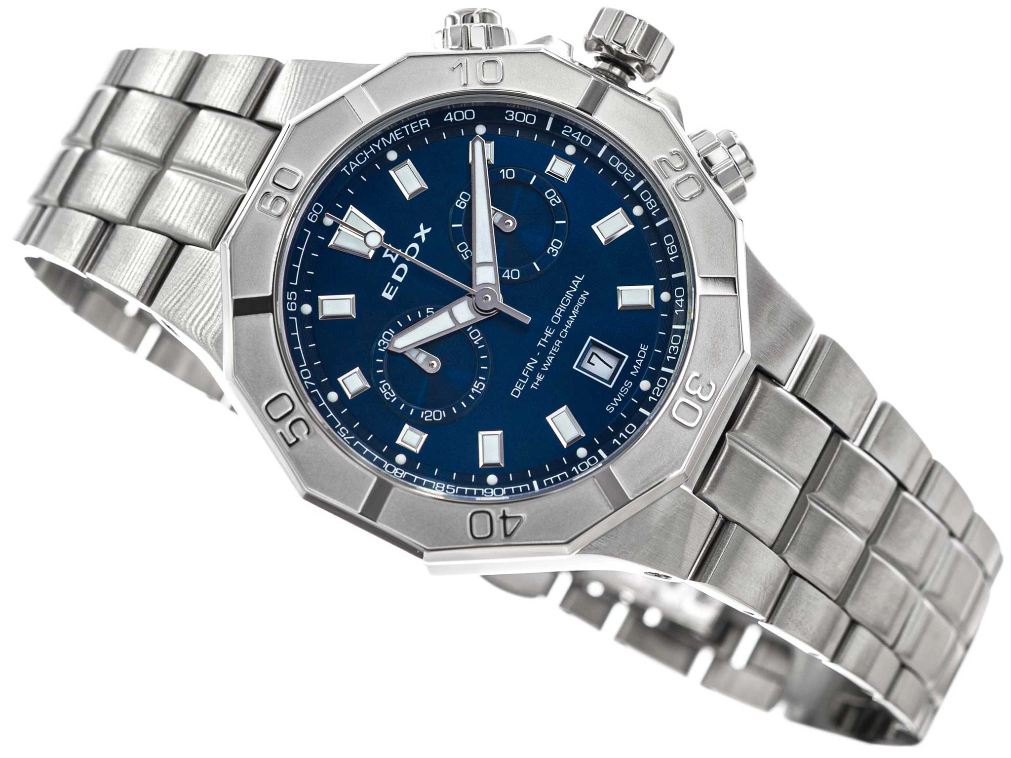Edox 10113 3M BUIN Delfin The Original Chronograph to wyjątkowy przykład połączenia szwajcarskiej precyzji, sportowej funkcjonalności i elegancji, która nie traci swojego uroku w żadnej sytuacji. Zaprojektowany z myślą o osobach poszukujących zegarka o ponadczasowym charakterze, wyróżnia się masywną, srebrną kopertą wykonaną ze stali szlachetnej, której wykończenie harmonijnie współgra z dopasowaną, solidną bransoletą zakończoną dwudzielnym zapięciem motylkowym. Granatowa tarcza, zdobiona szlifem słonecznym, subtelnie zmienia swój odcień w zależności od kąta padania światła, tworząc efekt głębi i podkreślając luksusowy charakter modelu.