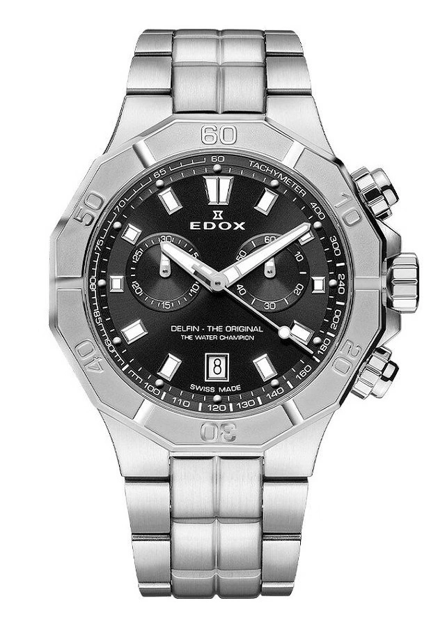 Edox 10113 3M NIN Delfin The Original Chronograph charakteryzuje doskonałe połączenie szwajcarskiej precyzji, sportowej funkcjonalności i elegancji, która nie traci swojego uroku w żadnej sytuacji. Zaprojektowany z myślą o osobach poszukujących zegarka o ponadczasowym charakterze, wyróżnia się masywną, srebrną kopertą wykonaną ze stali szlachetnej, której wykończenie harmonijnie współgra z dopasowaną, solidną bransoletą zakończoną dwudzielnym zapięciem motylkowym. Czarna tarcza jest klasyczna, funkcjonalna i elegancka, co podkreśla luksusowy charakter modelu.
