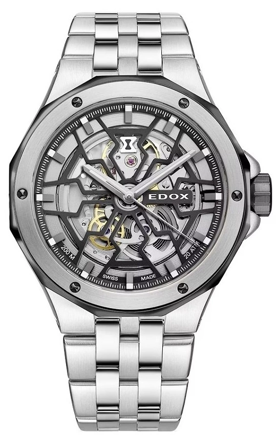 W sercu zegarka znajduje się szwajcarski mechanizm automatyczny cal. 853 (SW200), który dzięki 26 kamieniom łożyskującym gwarantuje niezawodną i precyzyjną pracę. Mechanizm ten automatycznie nakręca się przy każdym ruchu nadgarstka, co zapewnia wygodę użytkowania i eliminuje potrzebę codziennego nakręcania. Dzięki otwartej konstrukcji typu skeleton można podziwiać szczegóły działania tego imponującego mechanizmu, zarówno przez transparentną tarczę, jak i przeszklony dekiel, co z pewnością zachwyci każdego miłośnika finezyjnego rzemiosła zegarmistrzowskiego. Centralnym punktem zegarka jest unikalna tarcza, zaprojektowana z niezwykłą starannością i dbałością o szczegóły. Składa się ona z kompozycji srebrnych, szarych oraz transparentnych elementów, uzupełnionych subtelnym logo EDOX. Indeksy godzinowe mają formę minimalistycznych, liniowych znaczników, a dla poprawy czytelności w słabym świetle zostały pokryte, podobnie jak wskazówki, fosforyzującą powłoką neobrite. Po wcześniejszym naświetleniu powłoka ta świeci przez pewien czas, ułatwiając odczytanie godziny w ciemniejszych warunkach. Ochronę tarczy zapewnia szafirowe szkło, które dzięki zastosowanej powłoce antyrefleksyjnej gwarantuje doskonałą przejrzystość i minimalizuje odbicia światła. Syntetyczny szafir, charakteryzujący się wysoką czystością i wytrzymałością, jest wyjątkowo odporny na zarysowania, osiągając twardość równą 9 w skali Mohsa. Jest to idealne rozwiązanie dla luksusowego czasomierza, zapewniające jego długowieczność i doskonały wygląd.