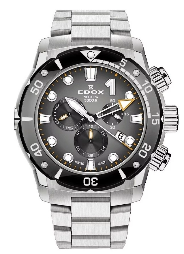 - Wodoszczelny Zegarek Męski Edox 10242 TINM GIDNO srebrny na bransolecie, posiada funkcję datownika, chronografu oraz neobrite.