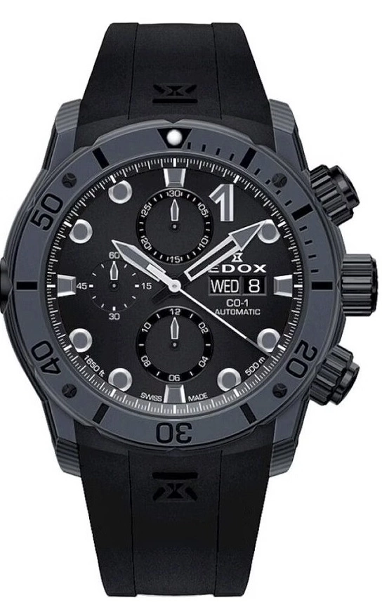 Czarna tarcza stanowi eleganckie tło dla srebrnych indeksów i wskazówek pokrytych powłoką luminescencyjną neobrite, która po wcześniejszym naświetleniu ułatwi odczytanie wskazań zegarka w złych warunkach oświetleniowych. Na szczególną uwagę zasługuje obrotowy bezel w szaro-czarnej kolorystyce, który poza funkcją estetyczną pełni również kluczową rolę użytkową. Jednokierunkowy mechanizm obrotu bezela eliminuje ryzyko przypadkowego przesunięcia, co czyni go niezwykle praktycznym rozwiązaniem podczas nurkowania. Precyzyjna faktura krawędzi sprawia, że bezel można wygodnie obsługiwać nawet w mokrych warunkach lub przy użyciu rękawic. Automatyczny zawór helowy, zintegrowany z kopertą, odgrywa istotną rolę w ochronie mechanizmu podczas dekompresji. Pozwala on na kontrolowane uwalnianie nagromadzonych cząsteczek helu, które mogą przenikać do wnętrza zegarka podczas długotrwałych zanurzeń w komorach ciśnieniowych. W połączeniu z zakręcaną koronką i solidnymi uszczelnieniami, konstrukcja ta zapewnia pełną ochronę przed wodą, pyłem i nadmiernym ciśnieniem. Rozmieszczone symetrycznie subtarcze chronografu podkreślają sportowy rodowód zegarka, a pierścień wewnętrzny wyposażono w skalę tachymetru, umożliwiającą dokładny pomiar średniej prędkości. Na godzinie trzeciej znalazł się praktyczny datownik wskazujący dzień tygodnia i dzień miesiąca. Sercem zegarka jest mechanizm automatyczny Caliber 011 (Sellita SW 500), znany z wysokiej precyzji i niezawodności, oferujący funkcję chronografu oraz 48-godzinną rezerwę chodu. Pracę mechanizmu można podziwiać przez przeszklony dekielek, który ujawnia staranność wykonania i kunszt zegarmistrzowski charakterystyczny dla marki Edox.