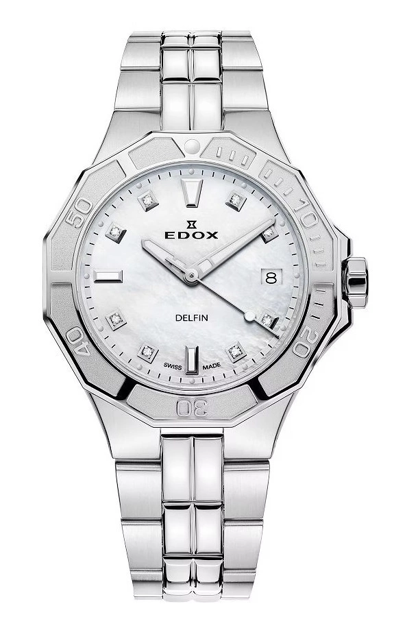 Edox 53020 3M NADN Delfin The Original Diver Lady Diamonds  to wyjątkowy zegarek damski typu diver, który stanowi harmonijne połączenie szwajcarskiego zegarmistrzostwa, nowoczesnych technologii oraz ponadczasowej elegancji. Stworzony dla kobiet wymagających niezawodności i stylu, sprawdza się zarówno w ekstremalnych warunkach, jak i w codziennym użytkowaniu. Jego solidna koperta, wykonana z najwyższej jakości stali szlachetnej, charakteryzuje się trwałością i odpornością na czynniki zewnętrzne, co czyni go idealnym towarzyszem zarówno podczas nurkowania, jak i formalnych spotkań. Dopełnieniem designu jest stalowa bransoleta, wyposażona w wygodne, dwudzielne zapięcie motylkowe, które zapewnia nie tylko komfort noszenia, ale również bezpieczeństwo. Imponująca wodoszczelność na poziomie 20 ATM pozwala na swobodne korzystanie z zegarka podczas pływania, nurkowania z akwalungiem i innych wodnych aktywności. Sercem tego modelu jest precyzyjny mechanizm kwarcowy, który dzięki zasilaniu wymienną baterią gwarantuje niezawodność i długotrwałą pracę. Jasna tarcza z perłowym wykończeniem subtelnie ozdobiona jasnymi indeksami na których umieszczono drobne diamenty i wskazówkami pokrytymi luminescencyjną powłoką neobrite, zapewnia po wcześniejszym naświetleniu doskonałą czytelność w każdych warunkach, nawet przy ograniczonym oświetleniu. Dodatkową funkcjonalność zapewnia datownik umieszczony na godzinie trzeciej, ułatwiający codzienne planowanie. Tarcza chroniona jest przez niezwykle trwałe szkło szafirowe, które dzięki wysokiej odporności na zarysowania i doskonałej przejrzystości podkreśla luksusowy charakter zegarka. Edox 53020 3M NANND Delfin The Original Diver Lady Diamonds to prawdziwy klejnot wśród zegarków, łączący nowoczesny design z niezrównaną funkcjonalnością i precyzją, będący kwintesencją szwajcarskiej tradycji zegarmistrzowskiej. Zapakowany w eleganckie opakowanie producenta, doskonale sprawdzi się jako wyjątkowy pomysł na prezent dla miłośniczek ekskluzywnych czasomierzy, które pragną podkreślić swoją pasję do stylu i przygody.