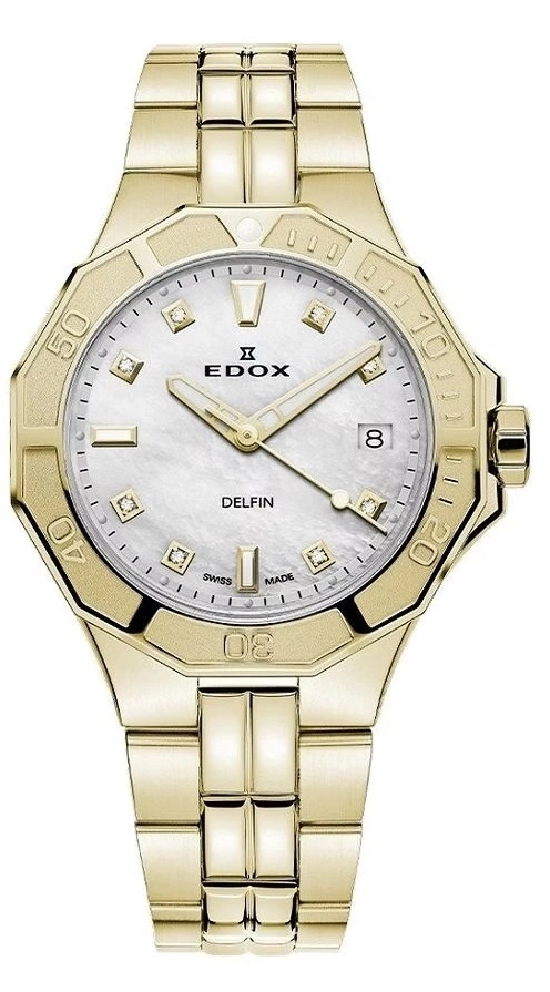 - Wodoszczelny Zegarek Damski Edox 53020 37JM NADD złoty na bransolecie. Posiada funkcje datownika oraz neobrite.