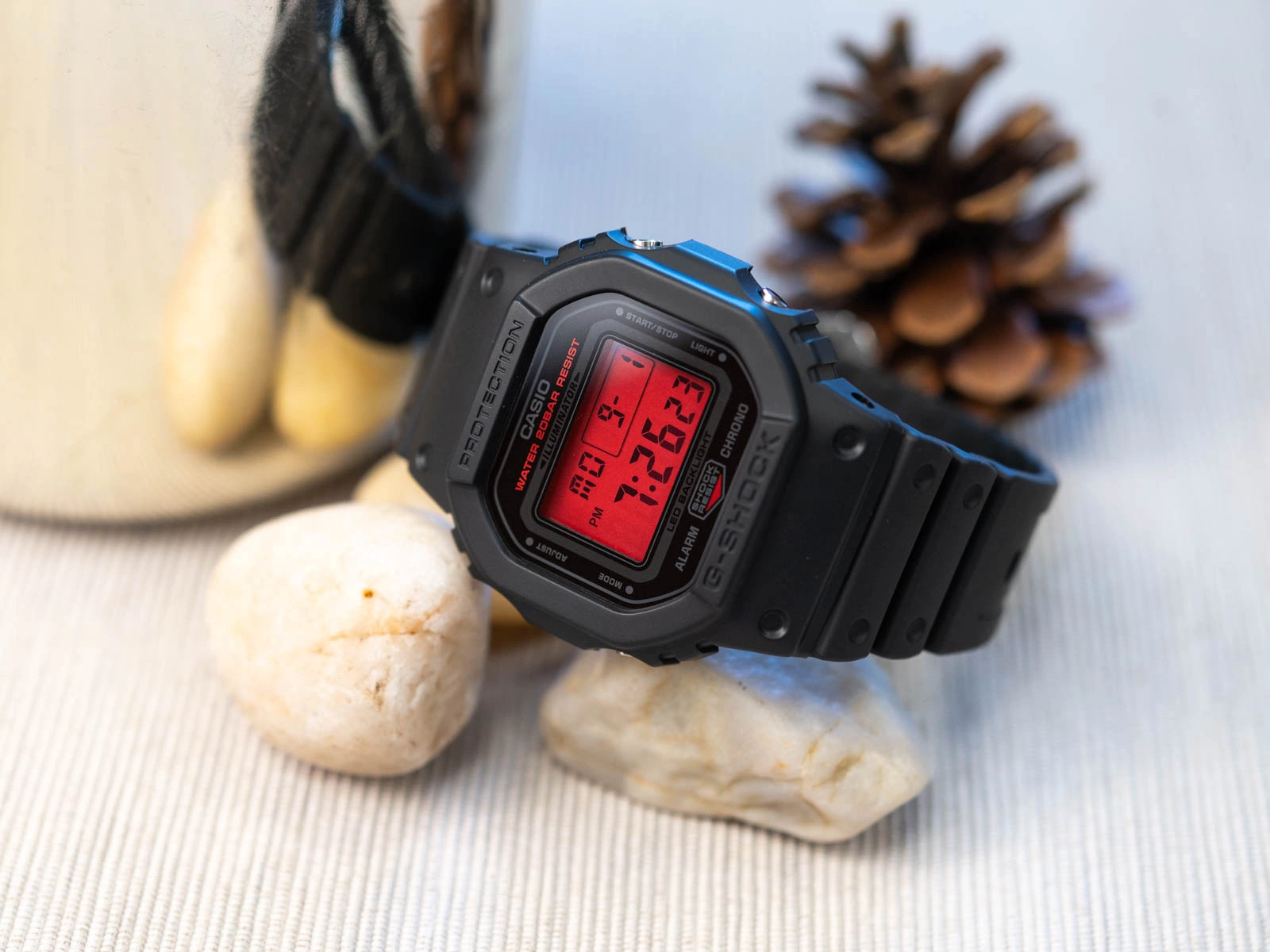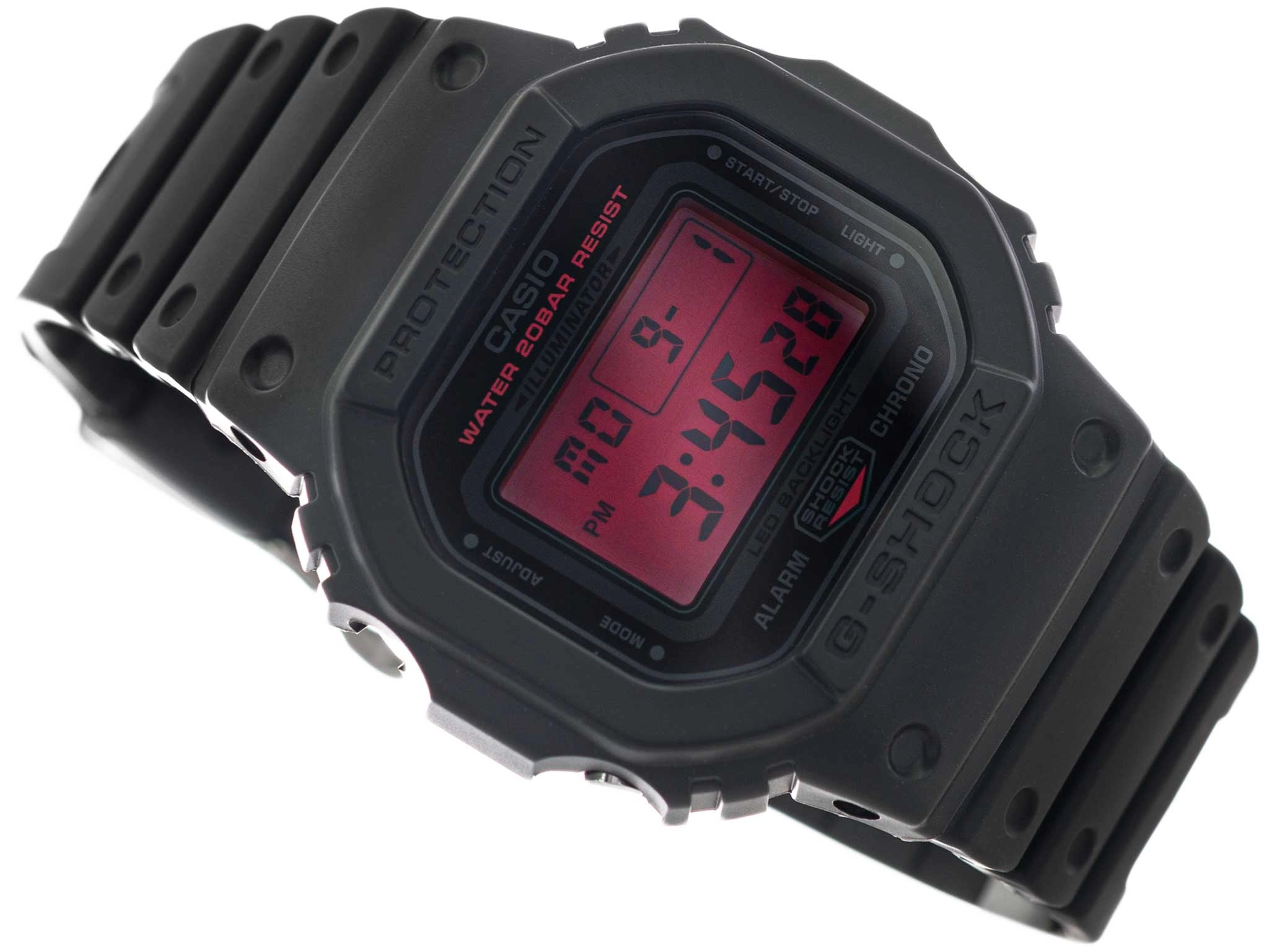 Funkcjonalność modelu DW-5600BBR-1ER to połączenie prostoty i niezawodności. Precyzyjny mechanizm kwarcowy współpracuje z czytelnym, czerwonym wyświetlaczem, który zapewnia wyraźny odczyt danych w każdej sytuacji. Na pokładzie znalazły się funkcje, które od lat czynią tę linię wyjątkowo praktyczną – stoper, timer, alarm dzienny, sygnał pełnej godziny oraz możliwość przełączania formatu 12/24-godzinnego. Funkcja podświetlenia umożliwia szybki i wygodny odczyt wskazań także po zmroku.