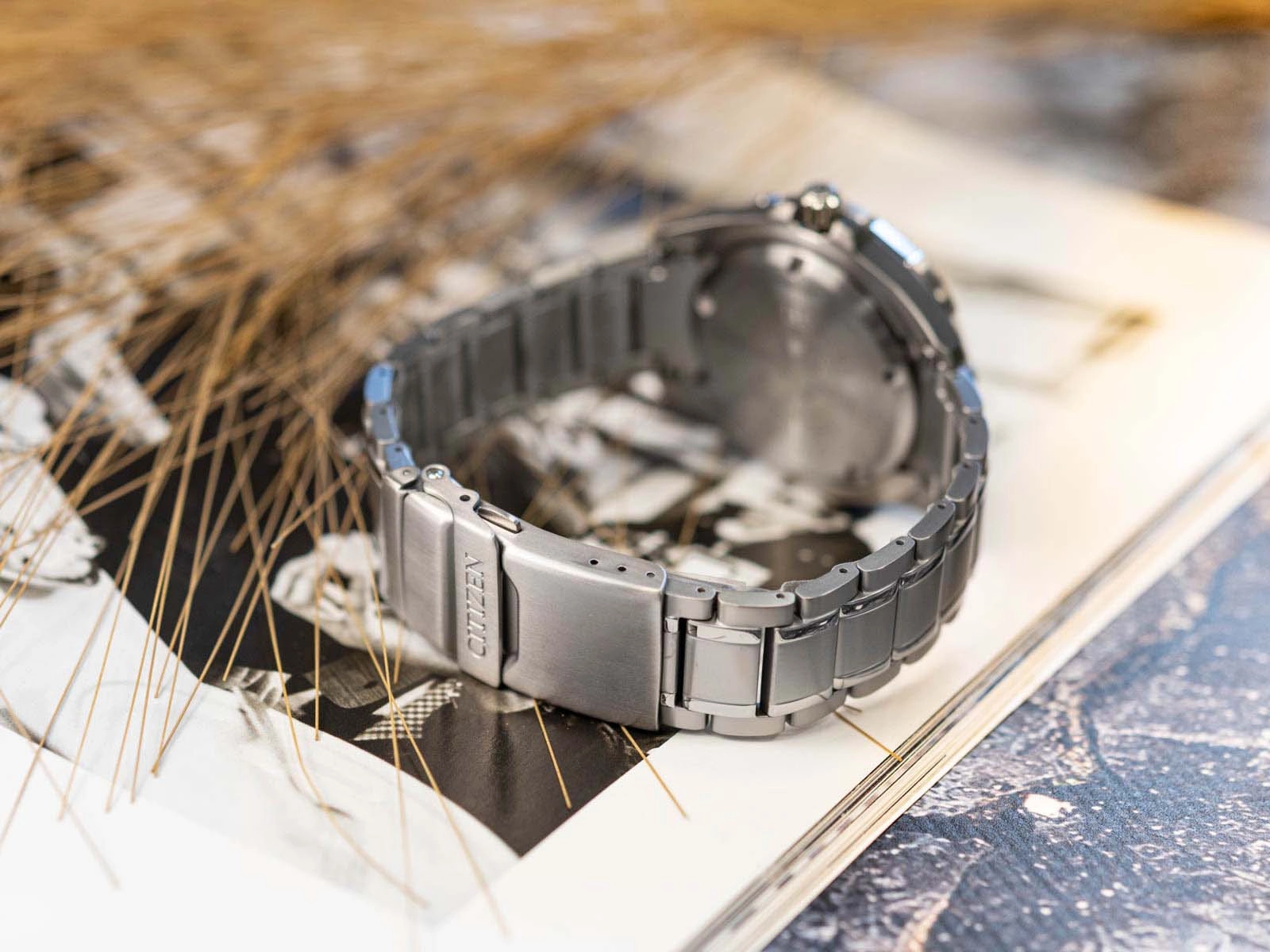 Sercem Citizen BN0201-88L Promaster Diver Eco-Drive jest kaliber E168, wykorzystujący technologię Eco-Drive. Mechanizm czerpie energię z dowolnego źródła światła – naturalnego lub sztucznego – i magazynuje ją w akumulatorze, zapewniając nieprzerwaną pracę przez około pół roku, nawet w całkowitej ciemności. To rozwiązanie, które eliminuje konieczność wymiany baterii, a przy tym idealnie wpisuje się w ideę odpowiedzialnego, zrównoważonego użytkowania. Bransoleta z pełnych ogniw, także wykonana z tytanu, dopełnia spójnego, technicznego charakteru zegarka. Zapięcie motylkowe z dodatkowym zabezpieczeniem gwarantuje stabilność noszenia, a starannie dopracowana ergonomia sprawia, że zegarek niemal stapia się z nadgarstkiem, zapewniając komfort noszenia przez cały dzień. Dzięki uniwersalnemu designowi Citizen BN0201-88L Promaster Diver Eco-Drive doskonale odnajduje się zarówno w środowisku sportowym, jak i w miejskiej codzienności, stanowiąc idealne połączenie praktycznego narzędzia i eleganckiego dodatku. W zestawie z zegarkiem znajduje się oryginalne opakowanie w formie butli nurkowej — detal, który podkreśla przynależność do kolekcji Promaster Diver i sprawdzi się również jako ciekawe opakowanie na prezent.