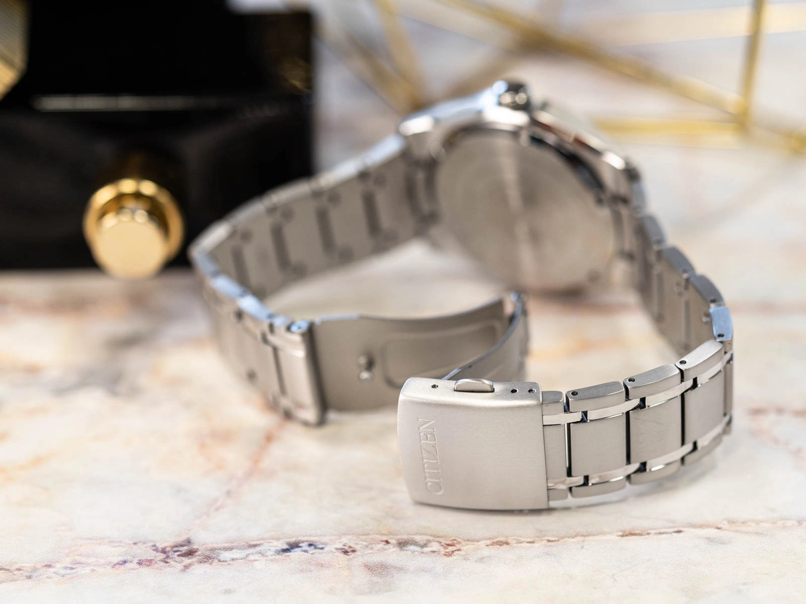 Citizen AW1240-57L Eco-Drive Super Titanium to przykład klasyki ujętej w nowoczesnej, technicznej formie. Harmonijne połączenie utrzymanych w kolorze srebrnym koperty i bransolety z zaawansowanego Super Titanium z granatową tarczą o subtelnym, promienistym szlifie nadaje zegarkowi elegancji, która nie traci nic ze swojego uniwersalnego charakteru. To projekt stworzony z myślą o osobach poszukujących zegarka o ponadczasowej formie, który łączy wyrafinowaną estetykę z wyjątkową lekkością i niezrównaną trwałością. Materiał Super Titanium, opracowany przez markę Citizen, wyróżnia się wyjątkowymi właściwościami – jest około 40% lżejszy od stali nierdzewnej, a jednocześnie kilkukrotnie bardziej odporny na zarysowania i korozję. Dzięki zastosowaniu powłoki Duratect powierzchnia koperty i bransolety zachowuje swój pierwotny blask nawet po wielu latach użytkowania, a zegarek przez cały ten czas wygląda niemal jak nowy. Bransoleta z pełnych ogniw oraz ergonomicznie wyprofilowana koperta tworzą konstrukcję, która doskonale układa się na nadgarstku, zapewniając wygodę niezależnie od sytuacji.