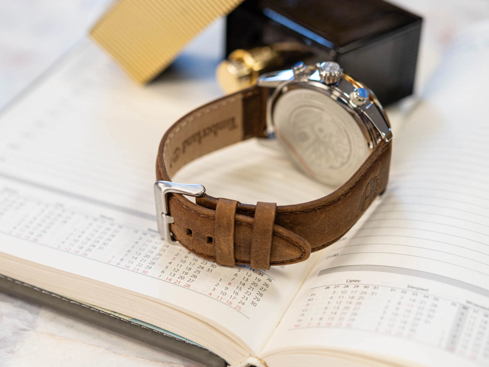 Cyferblat zegarka utrzymany jest w stonowanej, ciemnej kolorystyce, na której kontrastują wyraźne wskazówki oraz indeksy pokryte powłoką luminescencyjną neobrite, umożliwiając po wcześniejszym naświetleniu odczyt godziny w warunkach słabego oświetlenia. Tarcza została wzbogacona o trzy subtarcze datownika, wskazujące dzień tygodnia, dzień miesiąca oraz czas w formacie 24-godzinnym, co zwiększa funkcjonalność zegarka w codziennym użytkowaniu. Mechanizm kwarcowy, niezawodny i precyzyjny, gwarantuje długotrwałą i bezawaryjną pracę, a szkło mineralne skutecznie chroni tarczę przed zarysowaniami i utratą estetyki nawet przy intensywnym użytkowaniu.