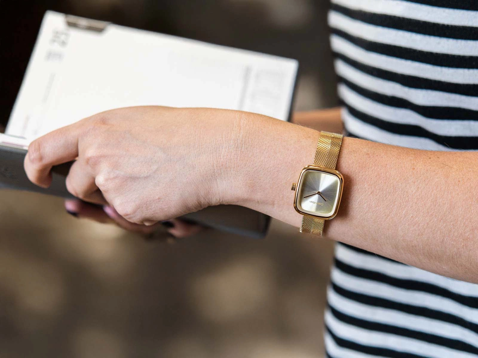 Calvin Klein 25100099 to zegarek, który w subtelny sposób łączy nowoczesne wzornictwo z klasyczną elegancją, tworząc dodatek o uniwersalnym charakterze. Całość utrzymana w złotej tonacji emanuje prestiżem i wyrafinowaniem, a minimalistyczna forma wpisuje się w estetykę marki, znanej z dbałości o detale i ponadczasowy design. Koperta oraz bransoleta typu mesh zostały wykonane ze stali szlachetnej pokrytej złotą powłoką, której blask podkreśla luksusowy wymiar zegarka. Bransoleta o drobnym, gęstym splocie doskonale układa się na nadgarstku, gwarantując wygodę noszenia i elegancki wygląd w każdej sytuacji. Jej długość można samodzielnie regulować, co pozwala dopasować zegarek bez konieczności wizyty u zegarmistrza. Pod płaskim szkłem mineralnym kryje się lśniąca tarcza o jednolitej, złotej tonacji, na której dyskretnie umieszczono logo Calvin Klein. Subtelne wykończenia, w połączeniu z prostotą formy, tworzą całość, która zachwyca spójnością i lekkością. Niezawodny mechanizm kwarcowy gwarantuje precyzję pomiaru czasu, a jego bezobsługowy charakter czyni zegarek praktycznym towarzyszem codzienności. Calvin Klein 25100099 to propozycja, która z łatwością odnajduje się zarówno w codziennych stylizacjach, jak i w bardziej formalnych zestawieniach, stając się dyskretnym, ale wyrazistym akcentem kobiecej garderoby. Oferowany w oryginalnym pudełku sygnowanym logo producenta, stanowi także idealną propozycję prezentową – elegancką, praktyczną i ponadczasową.