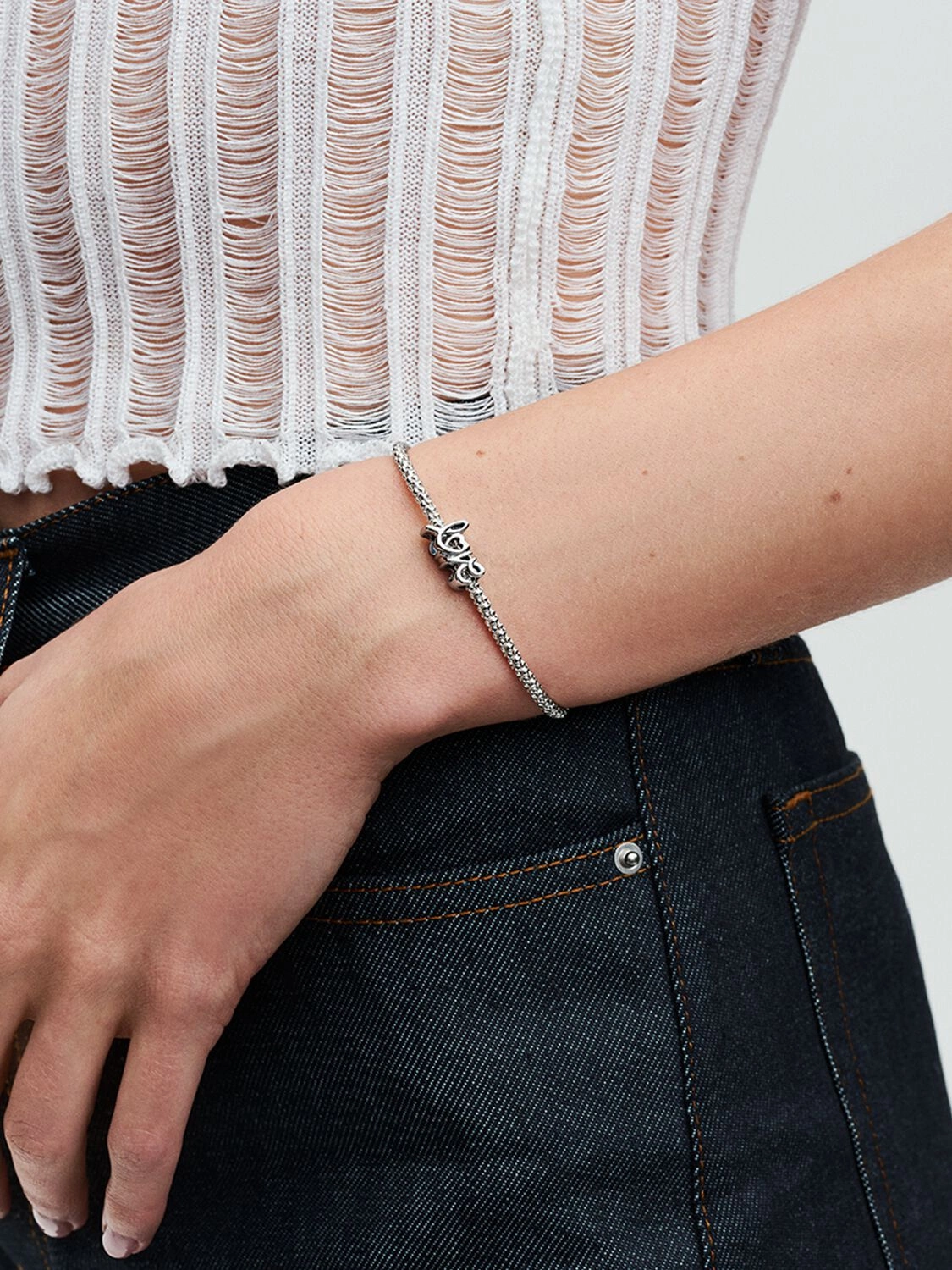 Charms Pandora w kształcie odręcznego napisu „love” 793055C00 to subtelna ozdoba, która w elegancki sposób wyraża uczucia. Srebrny element został zaprojektowany tak, aby przypominał lekki, swobodny zapis słowa „love”, widoczny również w lustrzanym odbiciu na odwrocie. Uwagę zwraca litera „o” uformowana w kształcie serca, która wprowadza do całości odrobinę radosnej symboliki i romantycznego wdzięku. Dzięki uniwersalnej estetyce charms może być noszony samodzielnie lub w zestawieniu z innymi symbolami miłości, tworząc osobistą i pełną emocji kompozycję na bransoletce Pandora Moments.