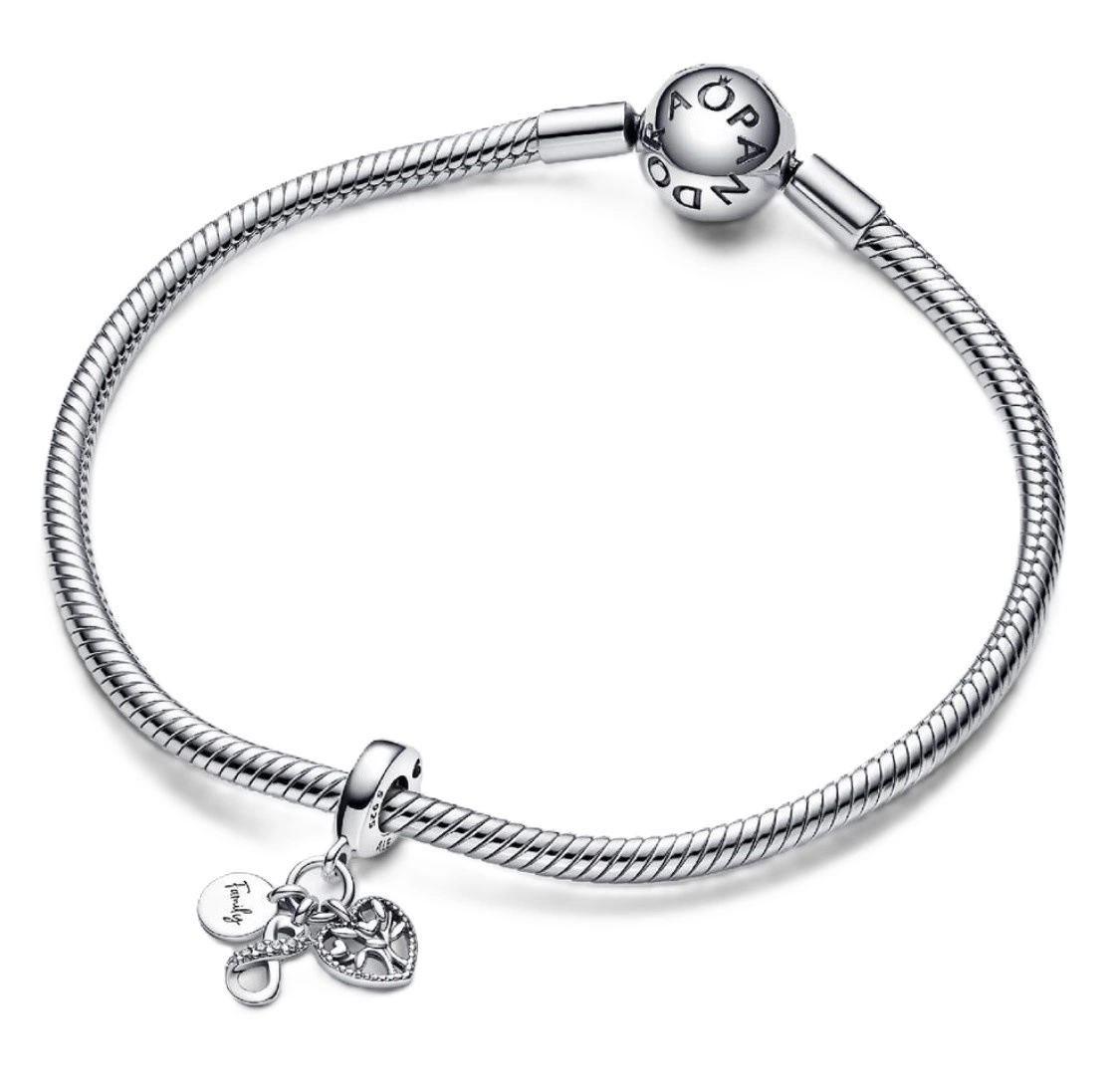 Charms Pandora Zawieszka Potrójna Rodzina na zawsze 792201C01 to srebrna ozdoba pełna symboliki więzi rodzinnych i miłości, które przetrwają pokolenia. Ażurowe serce zawiera misternie wykonane drzewo genealogiczne, będące symbolem bliskości, korzeni i rodzinnych wartości. Całość uzupełnia symbol nieskończoności wysadzany błyszczącą mozaiką pavé oraz grawerunek „Family”, który podkreśla znaczenie tej wyjątkowej relacji. Trzy elementy – serce, drzewo i nieskończoność – tworzą harmonijną kompozycję, będącą zarówno eleganckim dodatkiem do bransoletki Pandora Moments, jak i symbolicznym wyrazem miłości, trwałości i nieprzemijającej więzi rodzinnej.