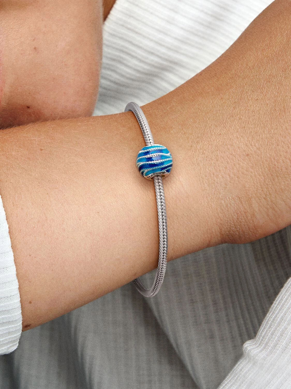 Charms Pandora Niebieska fala 797012ENMX to srebrna ozdoba inspirowana spokojem i siłą oceanu. Jego kulista forma została ręcznie pokryta emalią w odcieniach niebieskiego, tworząc efekt płynnych przejść barw przypominających ruch fal. Subtelna granulacja na powierzchni imituje spienioną wodę, dodając całości głębi i dynamiki. Ten charms wprowadza do kompozycji biżuteryjnej odświeżający akcent, który przywołuje na myśl kojący szum morza i poczucie wewnętrznej harmonii. Może zdobić zarówno bransoletkę Pandora Moments, jak i pełnić rolę zawieszki na naszyjniku, nadając stylizacji naturalnego, eleganckiego wyrazu.