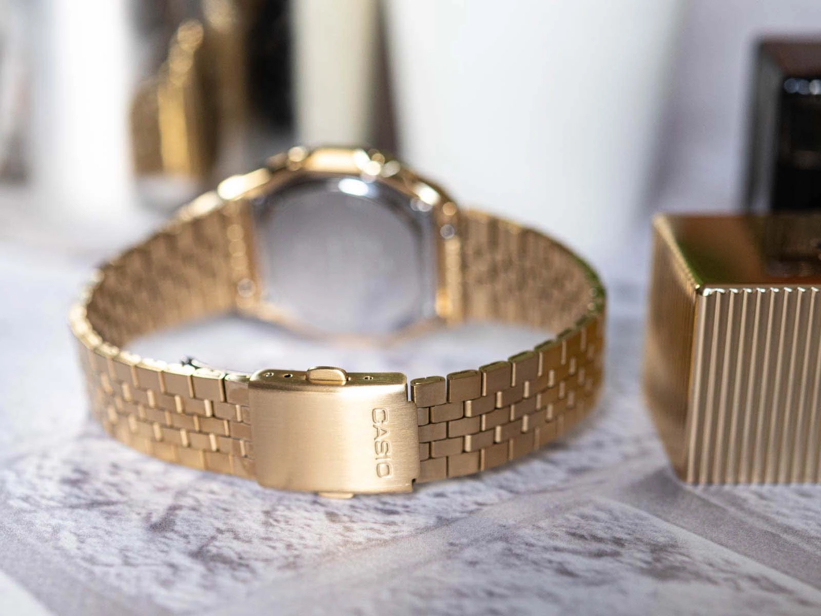 - Zegarek Casio A1000G 9 złoty na bransolecie, posiada funkcje takie jak stoper i datownik.