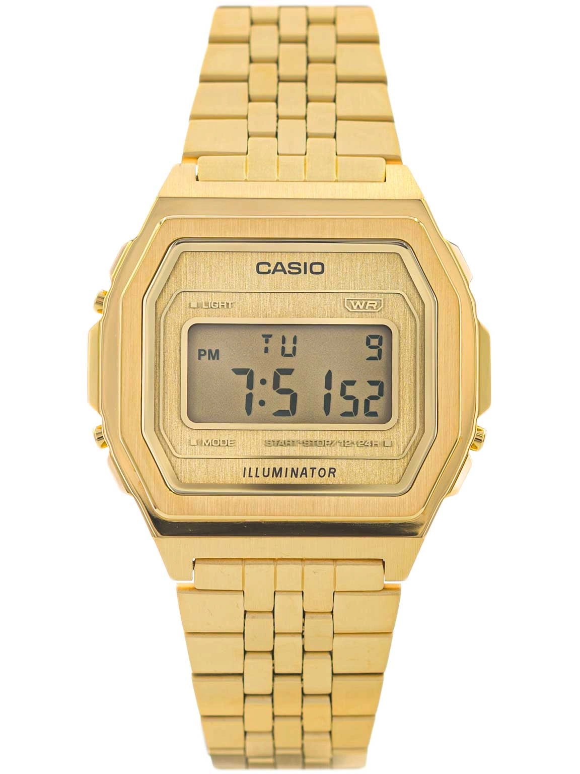 Casio A1000G-9EF to wyrafinowany hołd dla estetyki retro, ujęty w pełni złotej tonacji, która nadaje mu wyjątkowego charakteru. Smukła, geometryczna koperta wykonana z wysokiej jakości stali szlachetnej subtelnie odbija światło, tworząc elegancką grę refleksów. Złota bransoleta o klasycznym splocie płynnie przechodzi w kopertę, tworząc spójną, harmonijną całość. Tarcza, utrzymana w tej samej ciepłej barwie, podkreśla minimalistyczny charakter zegarka, pozostając wierną prostocie cyfrowych modeli z lat 80. Całość została zaprojektowana z myślą o trwałości i komforcie noszenia. Pod powierzchnią klasycznej formy kryją się funkcje, które czynią go praktycznym dodatkiem – stoper, alarm i podświetlenie zapewniają wygodę w każdej sytuacji. Casio A1000G-9EF to zegarek o ponadczasowym charakterze, który dzięki złotej kolorystyce staje się wyrazistym akcentem stylizacji. Łączy elegancję z dyskretną nutą vintage, sprawiając, że jest idealnym wyborem zarówno na co dzień, jak i do bardziej wyrafinowanych zestawień.