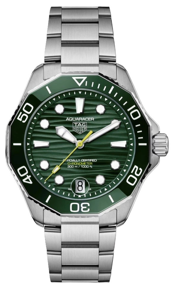 Tag Heuer WBP5116.BA0013 Aquaracer Professional 300 Date to zegarek, który ucieleśnia morskie dziedzictwo marki, łącząc niezawodność profesjonalnego narzędzia nurkowego z elegancją codziennego dodatku. Koperta ze stali szlachetnej została zestawiona z zieloną tarczą o falistym wzorze, inspirowanym głębią oceanu. Subtelne refleksy światła nadają jej dynamiki, a kontrastująca limonkowa wskazówka sekundowa przywołuje skojarzenia z energią natury i przygodą. Indeksy i wskazówki wypełnione powłoką Super-LumiNova gwarantują czytelność nawet w ciemności, co czyni zegarek wiernym towarzyszem w każdych warunkach. Profesjonalny charakter modelu podkreśla zielony, ceramiczny jednokierunkowy obrotowy bezel, który zwiększa bezpieczeństwo podczas nurkowania, a jednocześnie zachwyca głębią barwy i odpornością na zarysowania. Zintegrowana stalowa bransoleta o trzech rzędach ogniw została dopracowana tak, aby zapewniać komfort i stabilność, a jej precyzyjnie wykończone powierzchnie podkreślają luksusowy charakter czasomierza. Zapięcie motylkowe wyposażono w system zabezpieczeń, który daje pewność niezawodnego dopasowania nawet w dynamicznych sytuacjach. Sercem zegarka jest mechanizm automatyczny Calibre TH31-00 COSC, oferujący imponującą, 80-godzinną rezerwę chodu. Dzięki temu czasomierz pozostaje gotowy do działania nawet po kilku dniach przerwy w noszeniu. Wodoszczelność do 300 metrów, zakręcana koronka i solidna konstrukcja czynią go w pełni profesjonalnym narzędziem stworzonym do eksploracji podwodnych głębin. Jednocześnie jego uniwersalny charakter sprawia, że harmonijnie wpisuje się w codzienne stylizacje, dodając im sportowej elegancji i prestiżu. Tag Heuer WBP5116.BA0013 Aquaracer Professional 300 Date to hołd dla tradycji nurkowej w nowoczesnym wydaniu – zegarek, w którym każdy detal został zaprojektowany z myślą o perfekcji, niezależności i wyjątkowej trwałości.