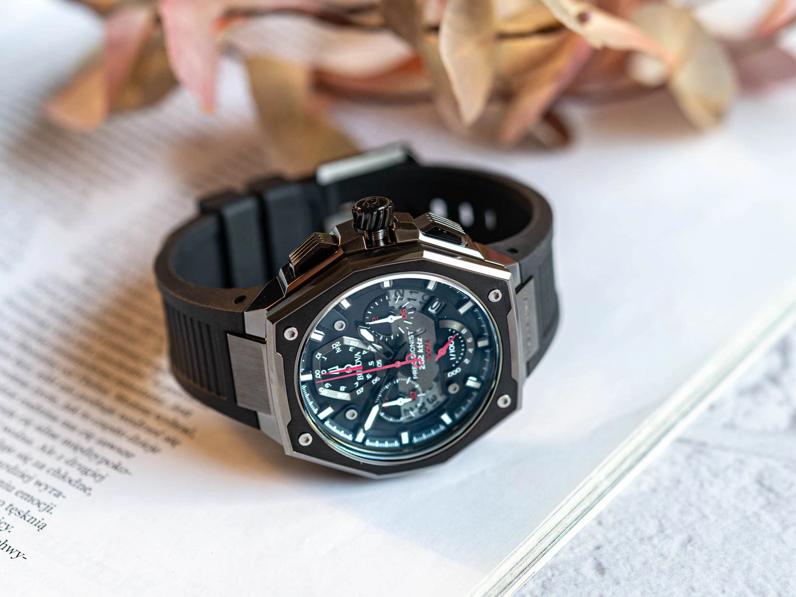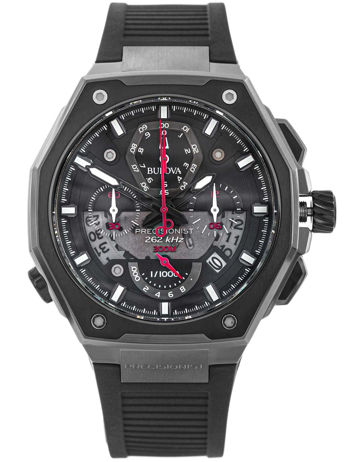 Bulova 98B358 Precisionist X to zegarek, który z wyjątkową precyzją łączy najnowsze osiągnięcia technologiczne z odważnym, nowoczesnym wzornictwem. Koperta ze stali szlachetnej w grafitowym odcieniu wyróżnia się wyraźnie zarysowaną, architektoniczną konstrukcją, w której każdy detal – od delikatnie fazowanych krawędzi po starannie wykończone powierzchnie – podkreśla solidność i elegancję jednocześnie. Na tle czarnej tarczy kontrastują wskazówki i indeksy w odcieniach srebra i bieli, zapewniając idealną czytelność w każdych warunkach oświetleniowych. Subtelnie dobrane proporcje elementów tarczy harmonizują z dynamicznymi subtarczami chronografu, obsługiwanymi za pomocą ergonomicznie rozmieszczonych przycisków po bokach koperty. Między godziną czwartą a piątą umieszczono datownik, który dyskretnie dopełnia kompozycję i zachowuje funkcjonalność przy codziennym użytkowaniu. Sercem zegarka jest opatentowany mechanizm kwarcowy Precisionist Ultra High Frequency 262 kHz, którego konstrukcja pozwala na wyjątkowo płynny ruch wskazówki sekundowej oraz niezrównaną dokładność, znacznie przewyższającą standardowe mechanizmy kwarcowe. Symbol 262 kHz na tarczy podkreśla obecność tej technologii i jednocześnie identyfikuje dziesięciolecie serii Precisionist. Czarny pasek z gumy o wyraźnej teksturze współgra z grafitową kopertą, nadając zegarkowi nowoczesną lekkość i sportowy charakter, zachowując jednocześnie wyrafinowaną elegancję. Tradycyjna sprzączka zapewnia wygodę noszenia, a staranne wykończenie paska podkreśla wysoką jakość całego czasomierza. Zegarek wyposażono w szafirowe szkło z powłoką przeciwodblaskową, które chroni tarczę przed zarysowaniami, a jednocześnie uwydatnia głębię koloru i kontrast indeksów. Zakręcana koronka i dekiel gwarantują wodoodporność do 300 metrów, co czyni zegarek niezawodnym towarzyszem zarówno w codziennych sytuacjach, jak i podczas ekstremalnych aktywności. Chronograf umożliwia precyzyjny pomiar czasu do 1/1000 sekundy, a ciągły, płynny ruch wskazówki sekundowej sprawia, że funkcja pomiaru jest równie elegancka wizualnie, co praktyczna. Wskazówki i indeksy wyposażono w fosforyzującą powłokę neobrite, która po wcześniejszym naświetleniu pozwala odczytać godzinę nawet w ciemności. Bulova 98B358 Precisionist X to czasomierz celebrujący dziesięciolecie technologii Precisionist, w którym innowacja i design tworzą spójną, harmonijną całość. Zegarek łączy elegancję, nowoczesność i wysoką funkcjonalność, wyróżniając się zarówno w formalnych, jak i sportowych stylizacjach. Czasomierz pakowany jest w eleganckie pudełko, które czyni go doskonałym pomysłem na prezent.