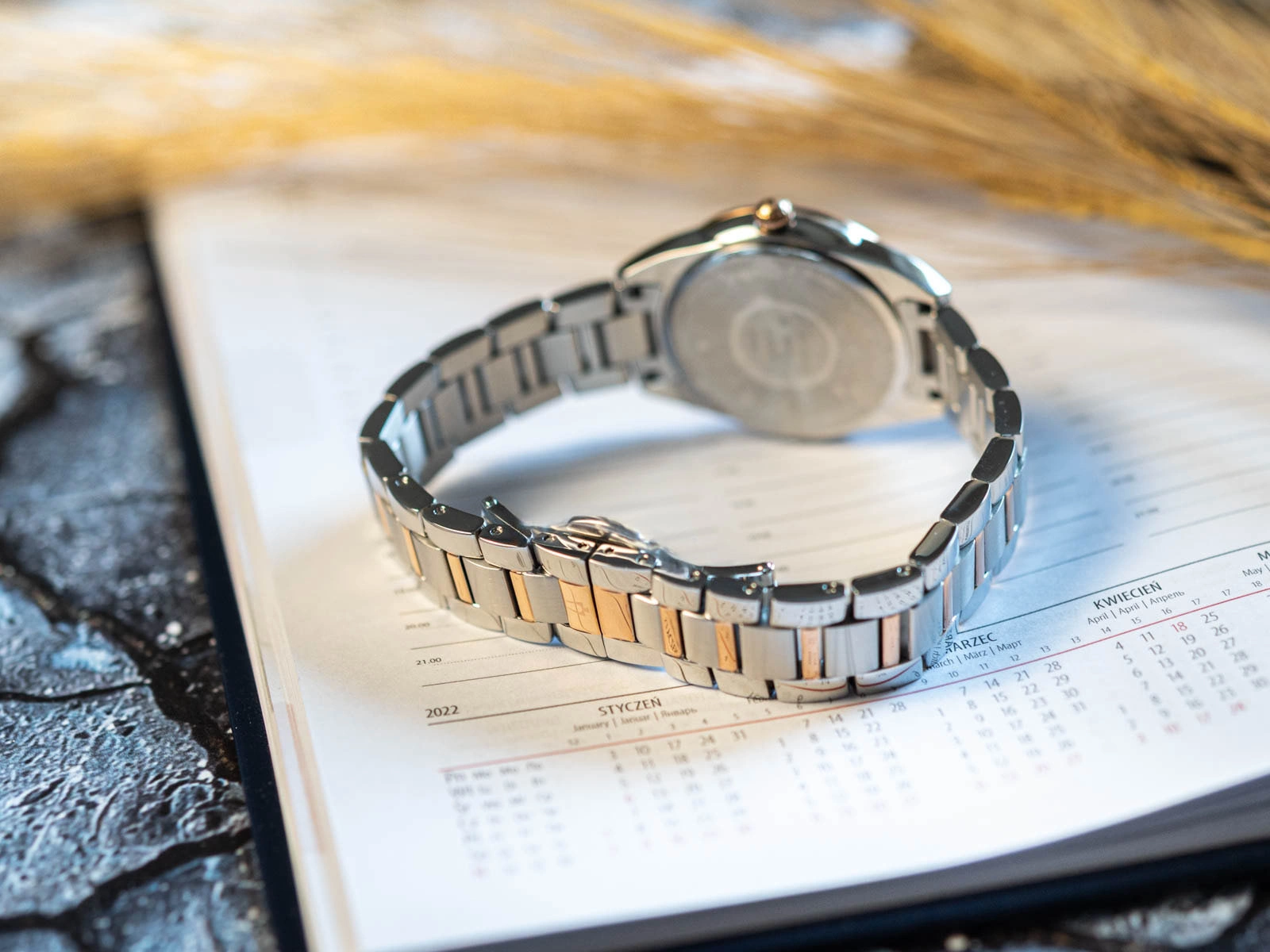 Bulova 98P183 Classic Diamonds to zegarek, który łączy subtelną elegancję z luksusowym wykończeniem, tworząc wyjątkowy dodatek dla kobiet ceniących ponadczasowy styl. Koperta i bransoleta wykonane ze stali szlachetnej prezentują harmonijne, dwukolorowe zestawienie: srebrna powierzchnia koperty kontrastuje z pierścieniem oraz detalami w odcieniu różowego złota, nadając całości wyrafinowanego charakteru. Tarcza, wykonana z masy perłowej, mieniącej się delikatnymi refleksami, została zdobiona ośmioma diamentami oraz subtelnymi, liniowymi indeksami w kolorze różowego złota na godzinach 3, 6 i 9, a logo Bulova na godzinie 12 dopełnia kompozycję, podkreślając ekskluzywny charakter czasomierza. Szkło szafirowe chroni tarczę przed zarysowaniami, zachowując klarowność odczytu i wydobywając głębię kolorów masy perłowej. Mechanizm kwarcowy japońskiej produkcji gwarantuje niezawodną precyzję chodu, a zasilanie wymienną baterią sprawia, że czasomierz jest wygodny w codziennym użytkowaniu. Bransoleta została wyposażona w eleganckie zapięcie motylkowe z przyciskiem, które łączy bezpieczeństwo z łatwością zakładania i zdejmowania, a także podkreśla luksusowy charakter zegarka. Bulova 98P183 Classic Diamonds to czasomierz, który łączy klasyczną formę z subtelnym blaskiem diamentów i złotych akcentów, oferując zarówno funkcjonalność, jak i wyjątkowy styl. Model doskonale komponuje się zarówno z formalnymi, jak i codziennymi stylizacjami, stając się wyrafinowanym symbolem elegancji, precyzji i ponadczasowego designu.