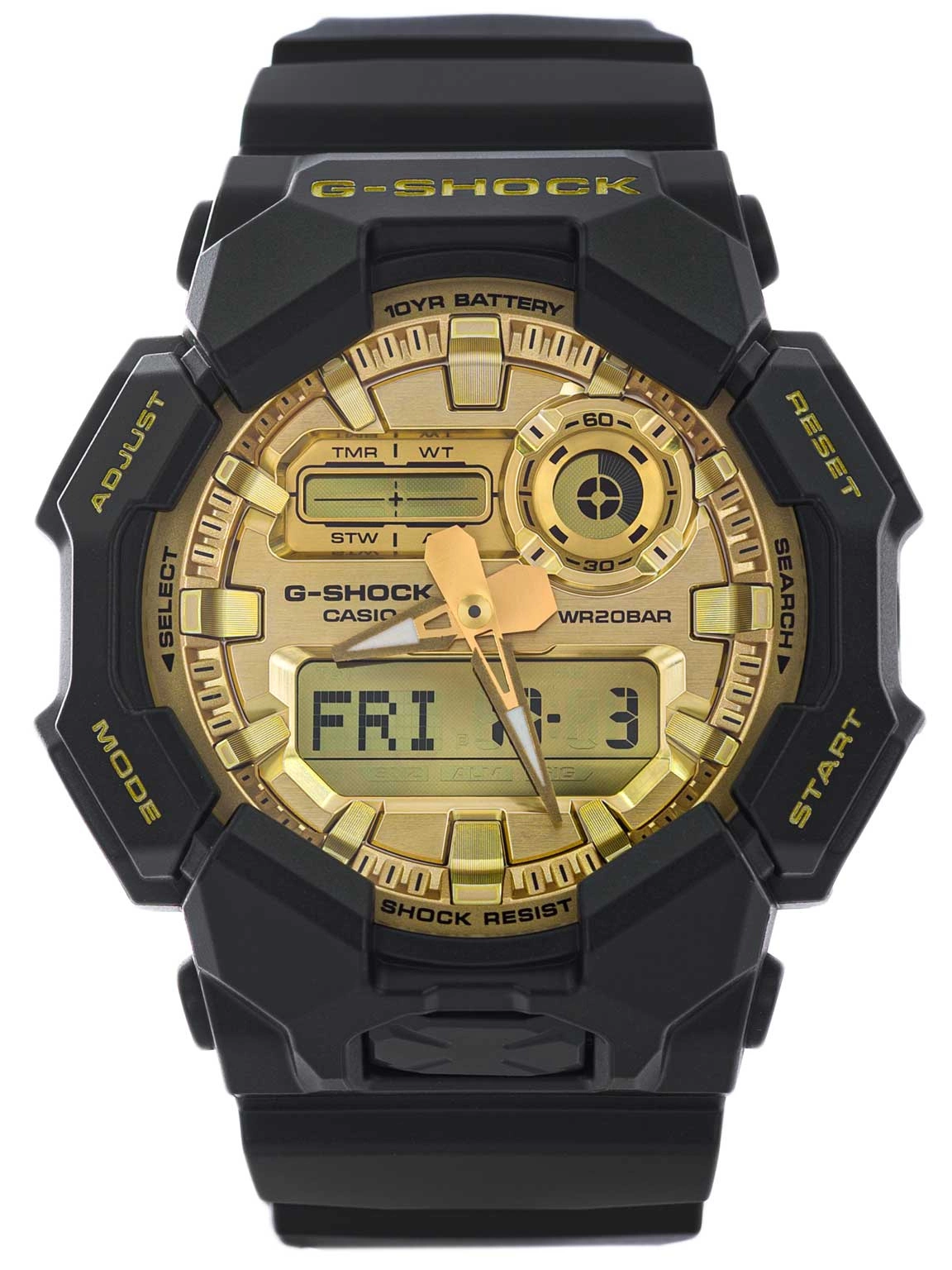 Mechanizm kwarcowy łączy niezawodność z wysoką dokładnością pomiaru czasu, podczas gdy konstrukcja G-SHOCK zapewnia odporność na wstrząsy i wodoszczelność do 20 BAR, co pozwala na korzystanie z zegarka w najbardziej wymagających sytuacjach. Funkcje takie jak stoper, timer, pięć alarmów, tryb drzemki oraz czas światowy sprawiają, że GA-010GGB-1A9ER jest nie tylko wyrafinowanym dodatkiem, ale także praktycznym narzędziem codziennego użytku. Zegarek emanuje spokojną pewnością siebie, łącząc sportowy charakter z wyrafinowanymi detalami. Złota tarcza w połączeniu z minimalistyczną czernią koperty tworzy harmonijny kontrast, który wyróżnia model GA-010GGB-1A9ER jako czasomierz gotowy sprostać zarówno wymaganiom codziennego życia, jak i wyrafinowanemu gustowi miłośników zegarków.
