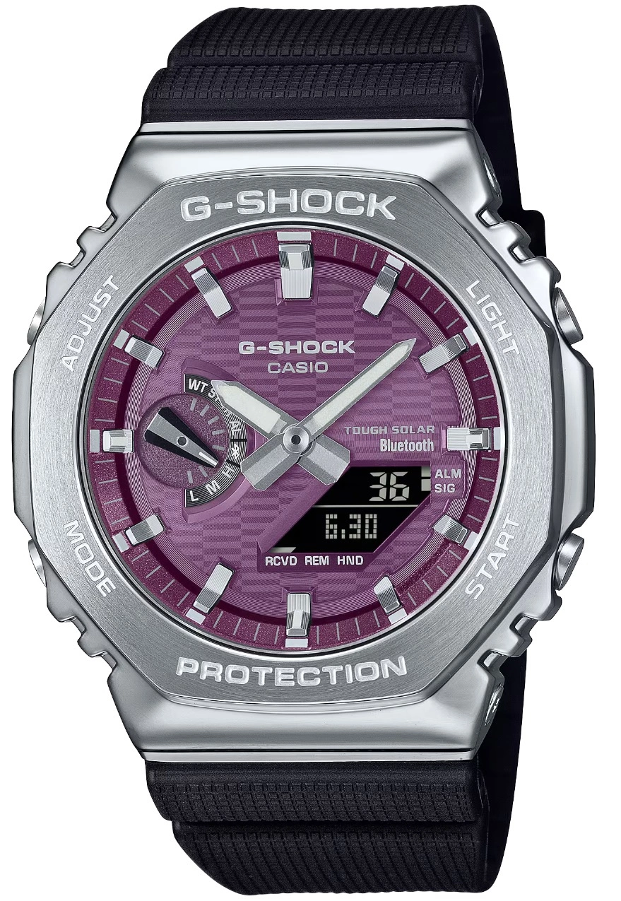 Casio G-SHOCK GBM-2100A-4BER to zegarek, w którym niezrównana wytrzymałość spotyka się z odważnym, nowoczesnym designem. Fioletowa tarcza w połączeniu ze srebrną kopertą ze stali szlachetnej i czarnym paskiem z tworzywa tworzy efektowny kontrast, nadając zegarkowi charakterystyczny, dynamiczny wygląd. Analogowo-cyfrowy cyferblat łączy klasyczne wskazówki z cyfrowym wyświetlaczem, zapewniając przejrzystość i pełną funkcjonalność w każdych warunkach oświetleniowych. Wskazówki i indeksy pokryto powłoką neobrite, dzięki czemu po wcześniejszym naświetleniu subtelnie świecą w ciemności, a podświetlenie LED zwiększa komfort odczytu w nocy lub w słabym oświetleniu.