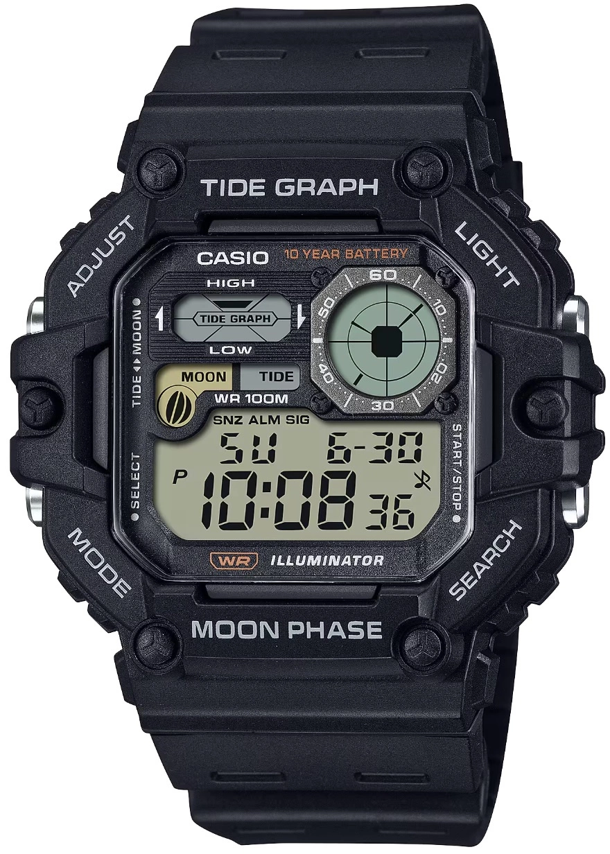 • Wodoszczelny Zegarek Męski Casio WS-1700H 1AVEF czarny na pasku, posiada funkcje takie jak stoper i datownik, wskaźnik faz księżyca oraz wskaźnik pływów.