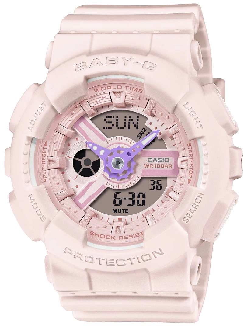 Zegarek Casio BABY-G BA-110AH-4AER to wyjątkowy czasomierz, który łączy modny, subtelny design z zaawansowaną funkcjonalnością, stworzony z myślą o kobietach prowadzących aktywny tryb życia. Pastelowy róż koperty, tarczy i paska nadaje zegarkowi delikatny, kobiecy charakter, jednocześnie wyróżniając go spośród codziennych akcesoriów. Subtelne akcenty na wskazówkach i indeksach dodają energii i ożywiają całość, tworząc harmonijną, estetyczną kompozycję, która przyciąga wzrok w każdej sytuacji. Koperta i pasek wykonane z wysokiej jakości tworzywa sztucznego zapewniają wytrzymałość i odporność na codzienne uszkodzenia, dzięki czemu zegarek sprawdza się zarówno podczas intensywnych treningów, jak i w codziennym użytkowaniu. Tarcza ozdobiona jest delikatnymi detalami, a wskazówki i indeksy pokryto powłoką neobrite, co pozwala na ich wyraźne świecenie w ciemności po wcześniejszym naświetleniu. Dodatkowo podświetlenie diodą LED zapewnia komfortowy odczyt godziny w każdych warunkach.