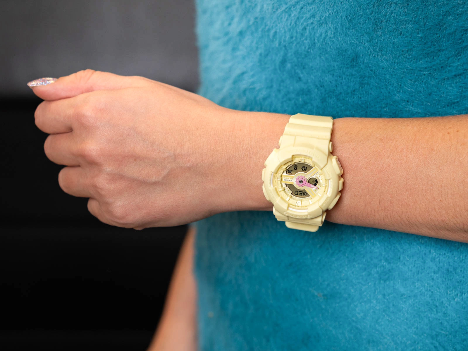 Model BA-110AH-9AER oferuje szereg praktycznych funkcji wspierających aktywny tryb życia. Zegarek posiada stoper, timer oraz czas światowy, pozwalający na szybkie sprawdzenie godziny w 48 miastach na całym świecie, co jest szczególnie użyteczne podczas podróży. Wodoszczelność do 10 ATM umożliwia pływanie i inne wodne aktywności, przy zachowaniu ostrożności przy obsłudze przycisków pod wodą. Casio BABY-G BA-110AH-9AER to zegarek, który łączy trwałość, funkcjonalność i wyrazisty, energetyczny design. Pastelowy żółty kolor sprawia, że staje się nie tylko niezawodnym narzędziem, ale także wyjątkowym dodatkiem, który ożywia każdą stylizację i podkreśla radosny, aktywny charakter właścicielki.