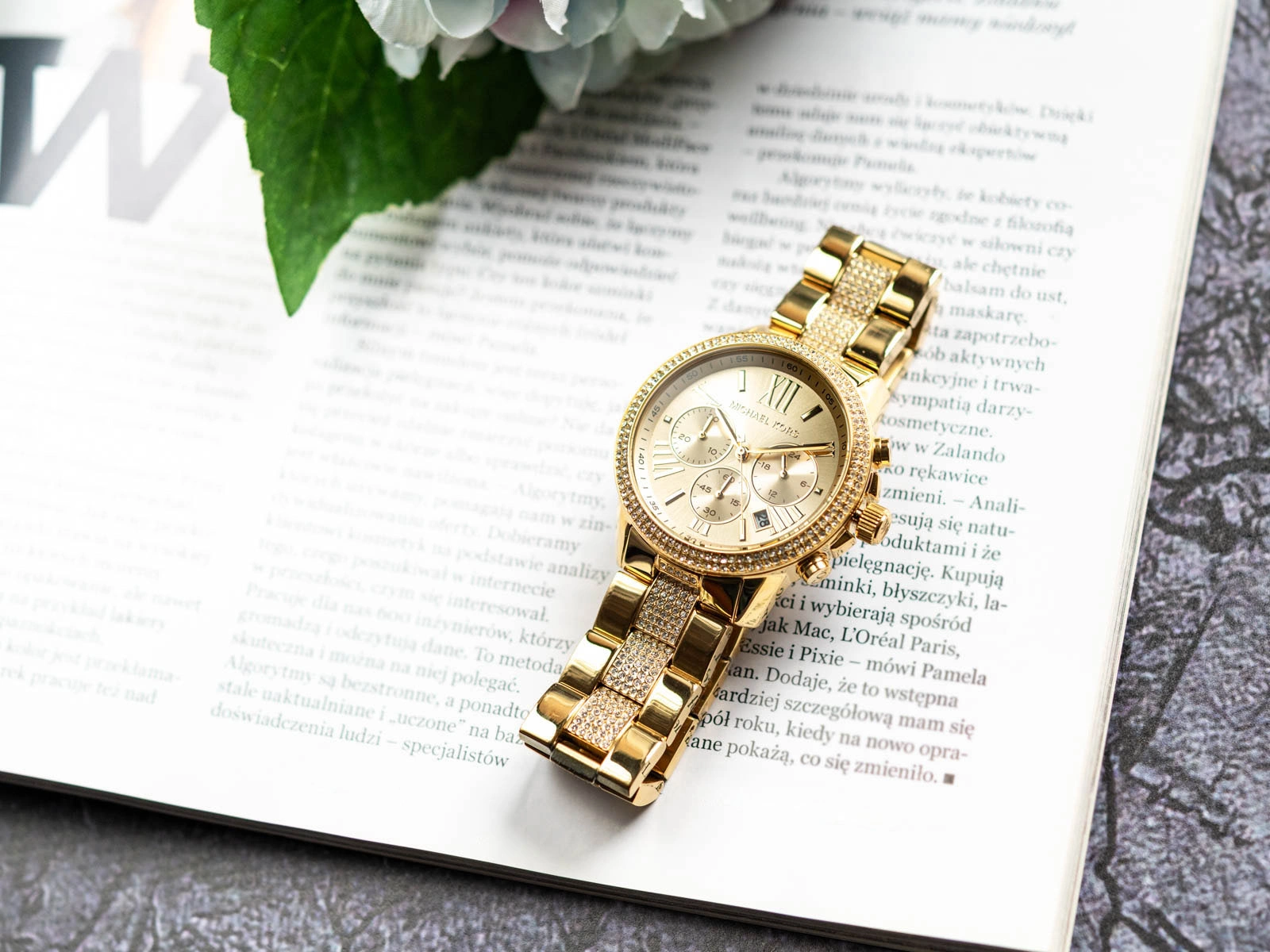 - Zegarek Damski Michael Kors MK7504 złoty na bransolecie, posiada funkcje datownika i stopera.
