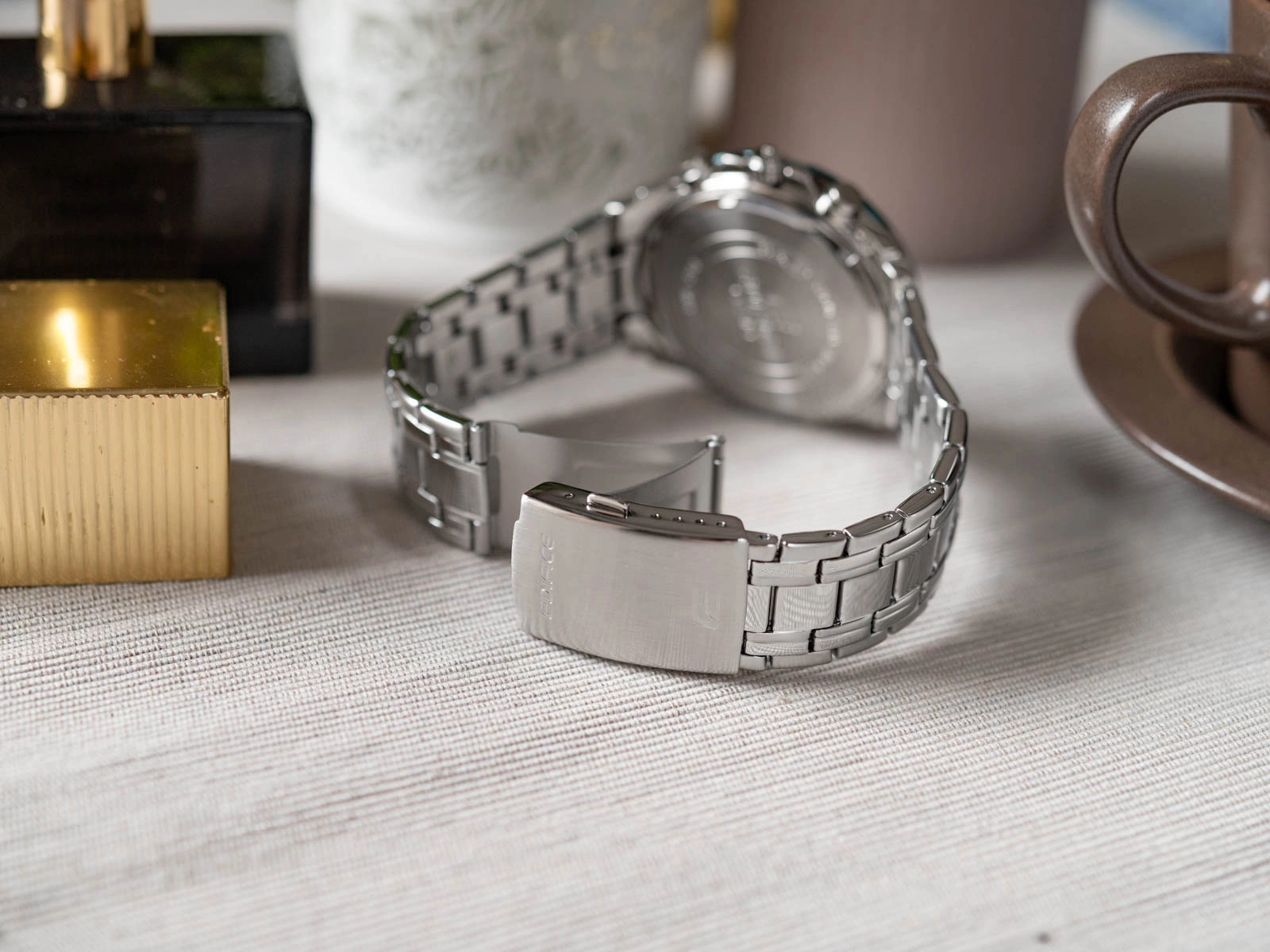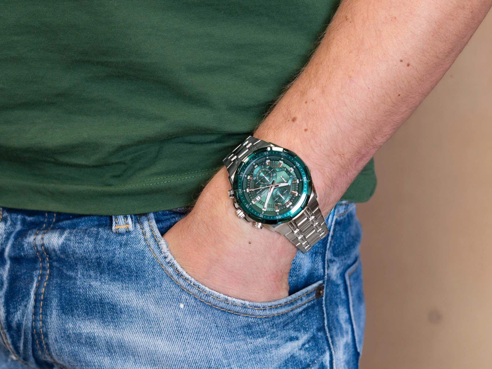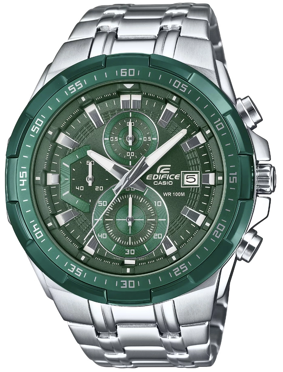Casio Edifice EFR-539DE-3AVUEF to zegarek, który wyróżnia się wyjątkowym połączeniem sportowego charakteru i eleganckiej formy. Koperta i bransoleta wykonane z wysokiej jakości stali szlachetnej nadają mu solidności i ponadczasowego stylu, a bezpieczne zapięcie motylkowe bransolety zapewnia komfort i stabilność podczas noszenia. Tym, co najbardziej przyciąga uwagę w tym modelu, jest tarcza utrzymana w intensywnym, zielonym kolorze. Jej głęboka barwa w połączeniu z subtelnie kontrastującymi subtarczami i wyrazistymi detalami nadaje całości świeżości i niepowtarzalnego charakteru. Srebrne indeksy i wskazówki, pokryte powłoką neobrite, gwarantują po wcześniejszym naświetleniu doskonałą czytelność także po zmroku, a przemyślany układ chronografu podkreśla sportową tożsamość zegarka.