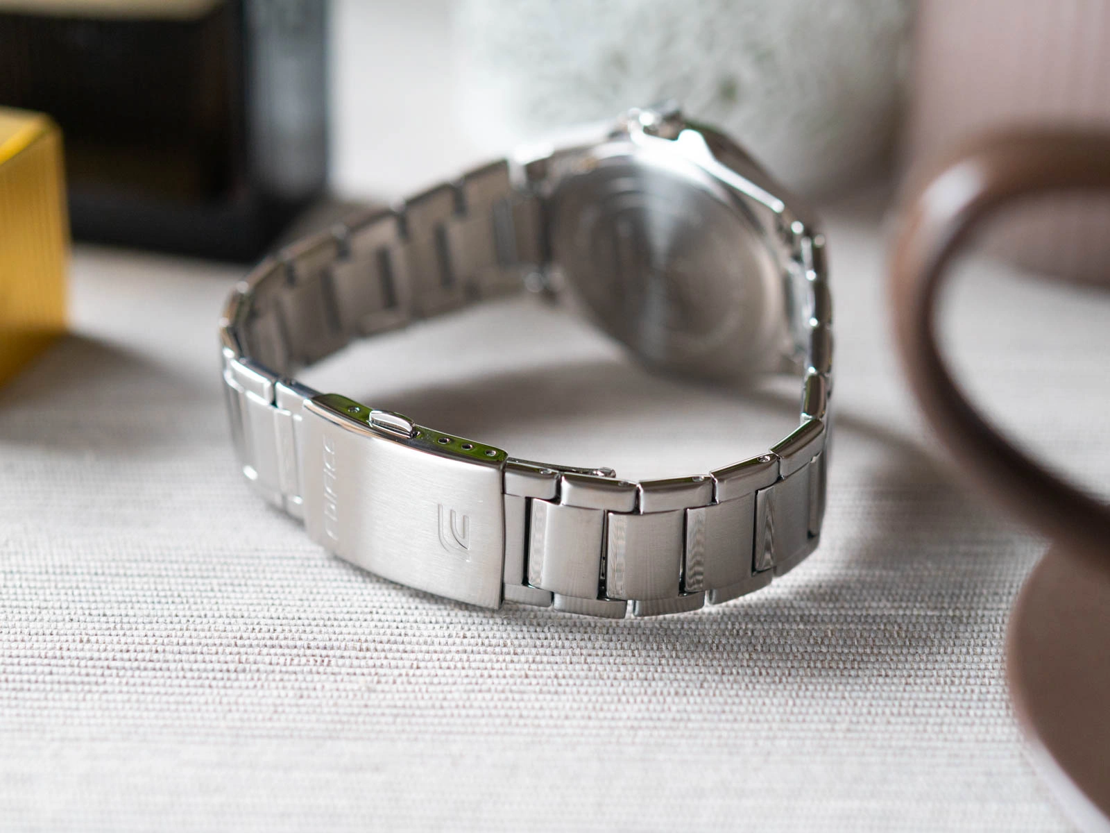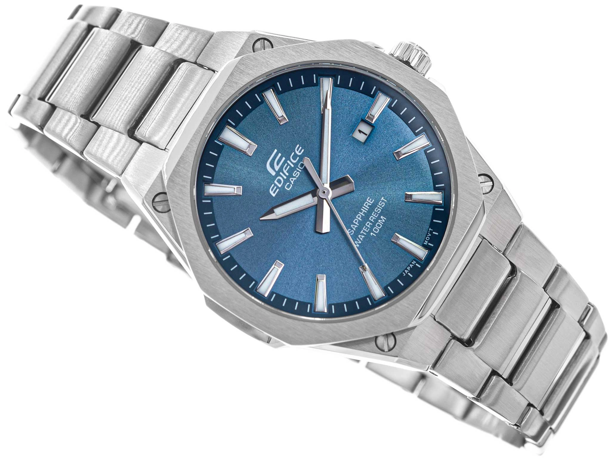 Zegarek męski Casio EDIFICE EFR-S108D-2AVUEF łączy w sobie klasyczną elegancję z wyrafinowaną funkcjonalnością. Koperta i bransoleta wykonane ze stali szlachetnej prezentują się w stonowanym, srebrnym odcieniu, który nadaje czasomierzowi uniwersalnego charakteru, harmonijnie łącząc się z niebieską tarczą ozdobioną delikatnym szlifem słonecznym. Tarcza, uzupełniona datownikiem wskazującym dzień miesiąca, wyróżnia się subtelną głębią koloru i starannym wykończeniem. Wskazówki i indeksy pokryto powłoką neobrite, zapewniającą po wcześniejszym naświetleniu czytelność w każdych warunkach oświetleniowych. Szkło szafirowe, znane z niezwykłej odporności na zarysowania, chroni tarczę, podkreślając zarazem elegancję całego zegarka. Mechanizm kwarcowy gwarantuje precyzyjne odmierzanie czasu oraz długotrwałą pracę na jednej baterii, która w standardowych warunkach może działać nawet przez trzy lata. Wodoszczelność na poziomie 10 ATM umożliwia swobodne korzystanie z zegarka podczas pływania, a solidne zapięcie motylkowe bransolety zapewnia bezpieczeństwo i komfort noszenia. Całość prezentuje się spójnie i harmonijnie, łącząc cechy sportowego zegarka odpornego na codzienne wyzwania z eleganckim, klasycznym wzornictwem. EFR-S108D-2AVUEF wyróżnia się wyrafinowaną prostotą i wysoką jakością wykonania, czyniąc go zegarkiem zarówno funkcjonalnym, jak i estetycznie atrakcyjnym. Zegarek został zapakowany w oryginalne pudełko producenta, które sprawdzi się jako opakowanie na prezent.