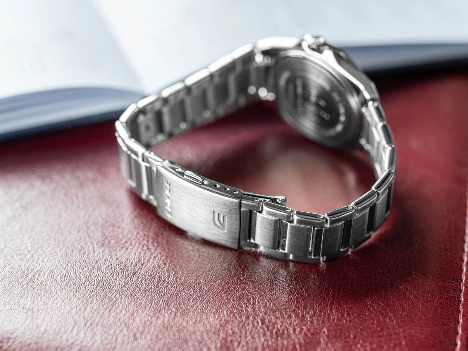 Zegarek męski Casio EDIFICE EFR-S108DE-2AVUEF łączy klasyczną elegancję z wyrafinowaną funkcjonalnością. Koperta i bransoleta wykonane ze stali szlachetnej prezentują się w stonowanym, srebrnym odcieniu, który nadaje czasomierzowi uniwersalnego charakteru, harmonijnie współgrając z niebieską tarczą ozdobioną delikatną fakturą, nadającą zegarkowi unikatowy charakter. Tarcza, uzupełniona datownikiem wskazującym dzień miesiąca, wyróżnia się starannym wykończeniem. Wskazówki i indeksy pokryto powłoką neobrite, zapewniającą po wcześniejszym naświetleniu czytelność w każdych warunkach oświetleniowych. Szkło szafirowe chroni tarczę przed zarysowaniami, podkreślając elegancję całego zegarka. Mechanizm kwarcowy gwarantuje precyzyjne odmierzanie czasu oraz długotrwałą pracę na jednej baterii, która w standardowych warunkach może działać nawet przez trzy lata. Wodoszczelność na poziomie 10 ATM umożliwia swobodne korzystanie z zegarka podczas pływania, a solidne zapięcie motylkowe bransolety zapewnia bezpieczeństwo i komfort noszenia. Całość prezentuje się spójnie i harmonijnie, łącząc cechy sportowego zegarka odpornego na codzienne wyzwania z eleganckim, klasycznym wzornictwem. EFR-S108DE-2AVUEF wyróżnia się wyrafinowanym minimalizmem i wysoką jakością wykonania, czyniąc go zegarkiem zarówno funkcjonalnym, jak i estetycznie atrakcyjnym. Zegarek został zapakowany w oryginalne pudełko producenta, które sprawdzi się jako opakowanie na prezent.