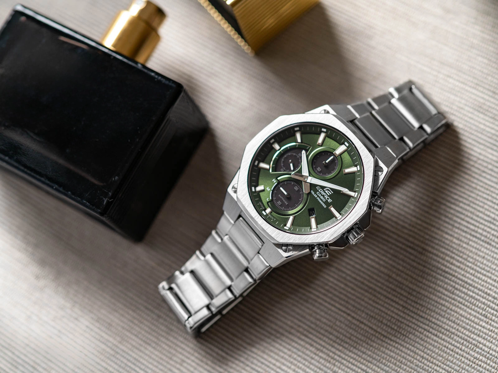 Casio Edifice EFS-S570D-3AUEF emanuje harmonijnym połączeniem elegancji i nowoczesnej technologii, tworząc zegarek o wyraźnym, zdecydowanym charakterze. Wykonana w całości ze stali szlachetnej koperta i bransoleta nie tylko podkreślają trwałość i odporność na korozję, lecz także nadają całości wyrafinowanego, industrialnego sznytu. Płaski, ośmiokątny bezel wprowadza subtelny akcent nowoczesności, natomiast głęboko zielona tarcza stanowi kontrapunkt dla srebrnych elementów, przyciągając spojrzenie swoją intensywnością i świeżością, a jednocześnie nadając zegarkowi nietuzinkowej elegancji. Sercem konstrukcji jest tarcza chroniona wytrzymałym szkłem szafirowym, które gwarantuje odporność na zarysowania oraz długotrwałą przejrzystość. Wbudowane panele słoneczne zasilają mechanizm zarówno energią słoneczną, jak i pochodzącą ze sztucznego światła, co eliminuje konieczność regularnej wymiany baterii i pozwala na korzystanie z pełni funkcji zegarka w sposób wygodny i niezawodny. Zegarek zachowuje smukłą sylwetkę, nie rezygnując przy tym z praktycznych udogodnień – analogowy stoper umożliwia kontrolę czasu w najbardziej wymagających sytuacjach, a delikatny datownik przy godzinie czwartej dyskretnie dopełnia funkcjonalność tarczy. Indeksy i wskazówki pokryte powłoką luminescencyjną neobrite zapewniają po wcześniejszym naświetleniu czytelność w ciemności, umożliwiając szybki odczyt czasu po wcześniejszym naświetleniu. Wodoszczelność na poziomie 100 metrów pozwala na komfortowe korzystanie z zegarka podczas pływania. Subtelne detale, takie jak precyzyjnie wykończone ogniwa bransolety czy delikatne, minimalistyczne giloszowanie tarczy, potęgują wrażenie dopracowania i jakości. EFS-S570D-3AUEF to zegarek dla mężczyzn, którzy cenią połączenie smukłej sylwetki z zaawansowaną funkcjonalnością, elegancją oraz nowoczesnym designem. Każdy element, od materiałów po detale wykończenia, został przemyślany tak, aby tworzyć harmonijną całość, a opakowanie producenta dopełnia prestiżowy charakter modelu, czyniąc go wyjątkowym zarówno w codziennym użytkowaniu, jak i w roli stylowego prezentu.
