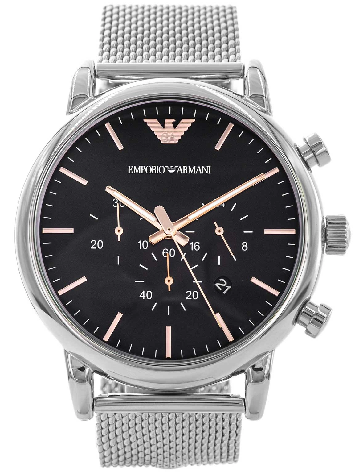 Emporio Armani Luigi AR11429 to wyjątkowy czasomierz, który łączy w sobie nowoczesny styl z klasyczną elegancją, tworząc propozycję idealną dla mężczyzn ceniących prestiż i wyrafinowany design. Marka Emporio Armani, znana z dbałości o szczegóły i najwyższą jakość wykonania, po raz kolejny proponuje model, który przyciąga uwagę i podkreśla indywidualny charakter właściciela. Centralnym elementem zegarka jest czarna tarcza , którą zdobią eleganckie akcenty w kolorze różowego złota. Zestawienie ciemnego tła i ciepłych detali tworzy harmonijny kontrast, nadając całości luksusowego i wyrazistego charakteru. Wskazówki zostały pokryte warstwą Neobrite, co zapewnia czytelność również w słabszych warunkach oświetleniowych, po uprzednim naświetleniu. Zegarek oferuje nie tylko elegancki wygląd, ale i praktyczne funkcje. Między godziną 4 a 5 umieszczono subtelny datownik wskazujący aktualny dzień miesiąca, który w dyskretny sposób dopełnia kompozycję tarczy. Dodatkowo czasomierz wyposażono w analogowy stoper umożliwiający precyzyjne odmierzanie czasu do 30 minut, obsługiwany jest za pomocą wygodnych, bocznych przycisków na kopercie.