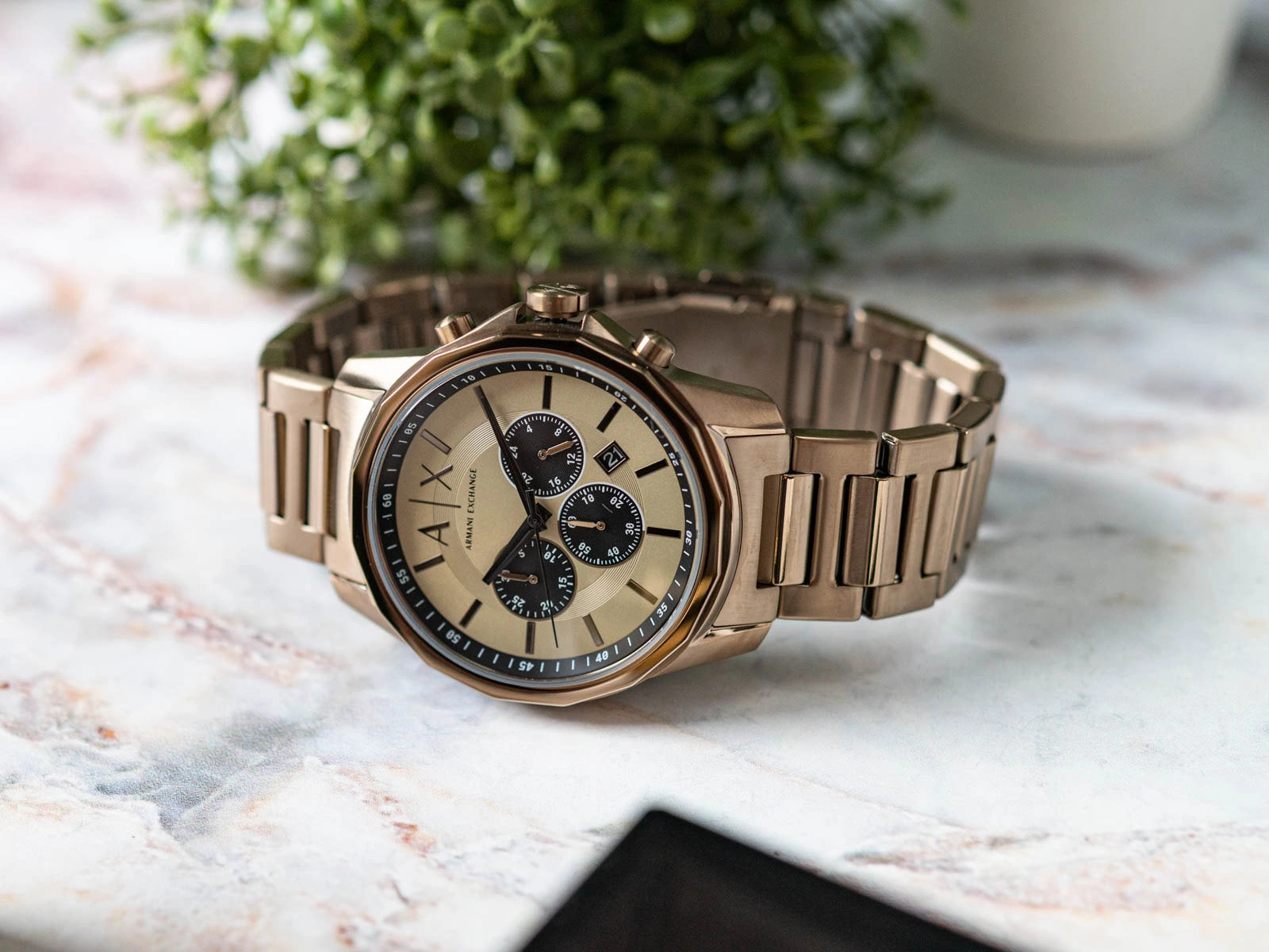 - Zegarek Męski Armani Exchange AX1739 złoty na bransolecie, posiada funkcje takie jak stoper i datownik.