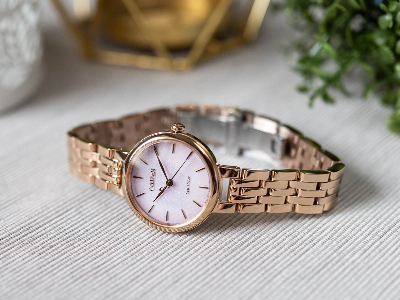 - Zegarek Damski Citizen EM0993-82X różowe złoto na bransolecie.