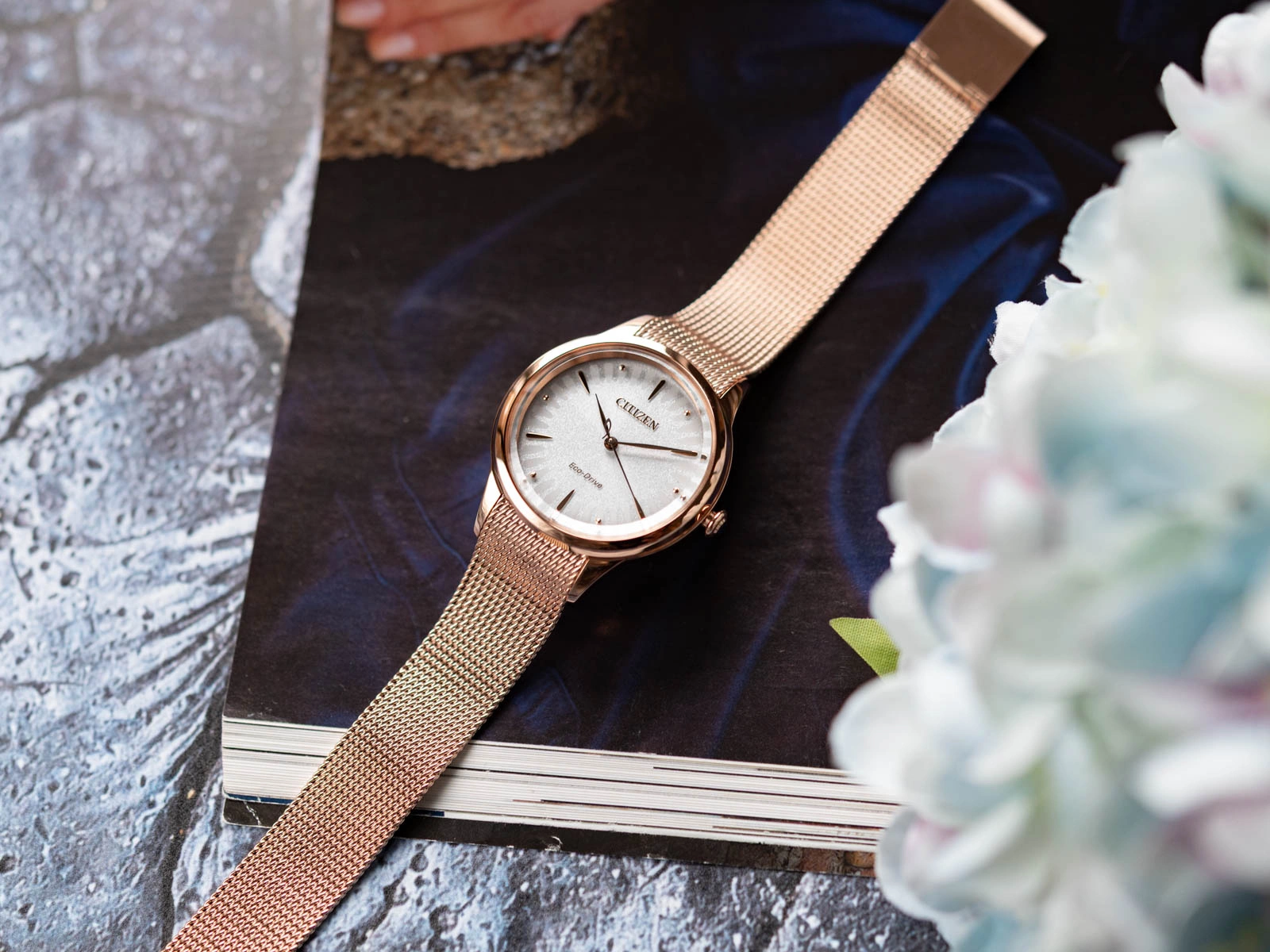 • Zegarek Damski Citizen EM1153-88A różowe złoto na bransolecie. Zegarek solarny.