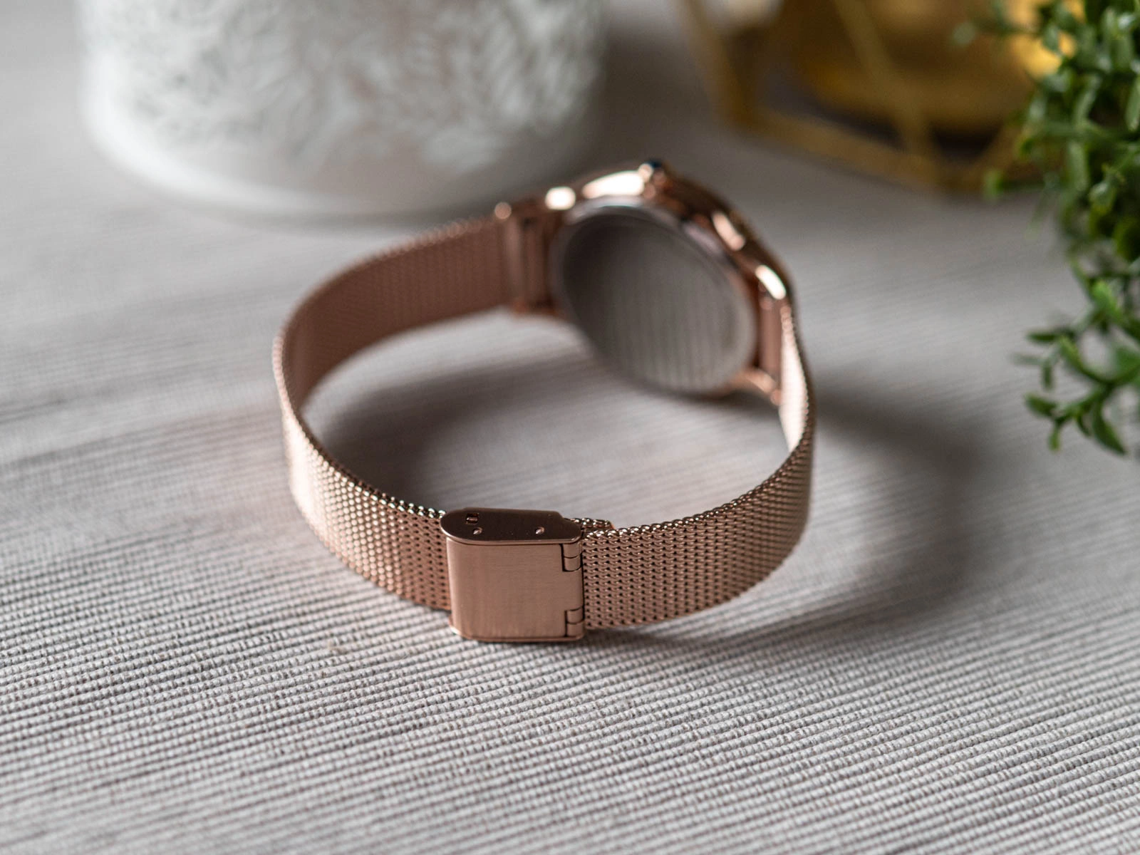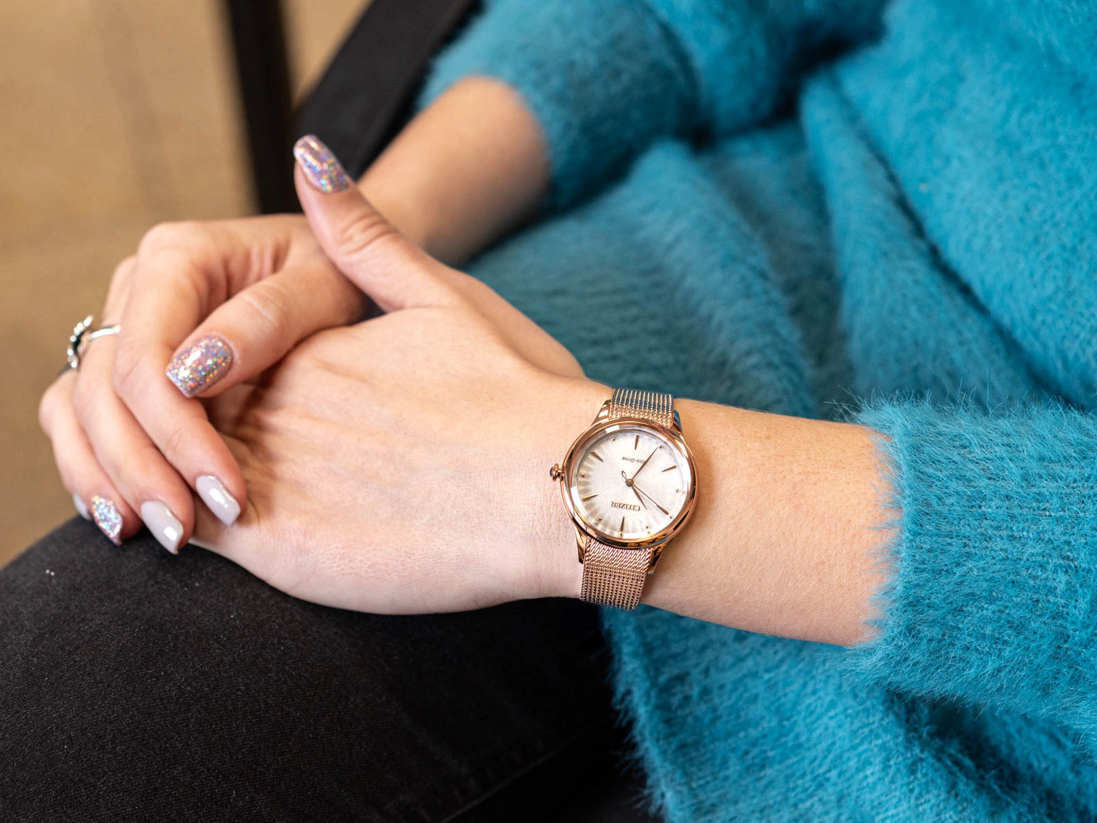 Citizen EM1153-88A Eco-Drive Citizen L Gerbera to wyrafinowany damski zegarek, w którym subtelność formy spotyka się z precyzją wykonania. Należący do eleganckiej kolekcji Citizen L Gerbera, inspirowanej delikatnością natury i ponadczasowym pięknem, stanowi doskonałe połączenie nowoczesnej technologii i klasycznego stylu. Koperta oraz bransoleta zegarka zostały wykonane z wysokiej jakości stali szlachetnej w odcieniu różowego złota, nadając całości ciepłego, kobiecego blasku. Delikatna bransoleta o splocie typu mesh zachwyca lekkością i precyzją wykonania, a dzięki sprytnemu mechanizmowi zapięcia można ją samodzielnie regulować, dopasowując idealnie do nadgarstka. Na tle srebrnej tarczy pięknie prezentują się wskazówki i indeksy w kolorze różowego złota, które podkreślają subtelną elegancję projektu. Harmonijne zestawienie barw nadaje zegarkowi ponadczasowego charakteru, sprawiając, że doskonale odnajduje się zarówno w codziennych, jak i bardziej formalnych stylizacjach. Tarcza przykryta jest szafirowym szkłem, odpornym na zarysowania i gwarantującym długotrwały, nienaganny wygląd. W jego wnętrzu pracuje precyzyjny japoński mechanizm Eco-Drive kaliber E031, zasilany światłem. Dzięki tej technologii zegarek nie wymaga wymiany baterii, łącząc wygodę użytkowania z troską o środowisko. Citizen EM1153-88A Eco-Drive Citizen L Gerbera to wyjątkowy przykład biżuteryjnej elegancji, w której estetyka spotyka się z funkcjonalnością. Subtelny, kobiecy i pełen blasku – stanowi kwintesencję nowoczesnego stylu w klasycznym wydaniu, będąc ozdobą każdego nadgarstka.