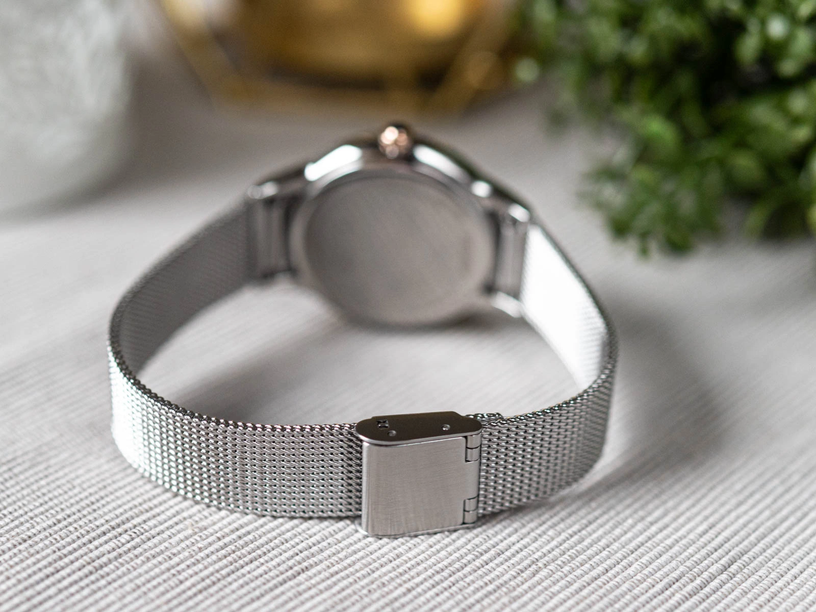 Citizen EM1156-80X Eco-Drive Citizen L Gerbera to subtelny i pełen wdzięku damski zegarek, w którym klasyka srebra spotyka się z delikatnym akcentem różowego złota. Wzornictwo inspirowane naturą i charakterystyczna dla kolekcji Citizen L Gerbera harmonia form sprawiają, że zegarek ten zachwyca zarówno elegancją, jak i finezją detalu. Koperta i bransoleta zostały wykonane z wysokiej jakości stali szlachetnej w kolorze srebrnym, co nadaje całości świeżości i ponadczasowego uroku. Delikatna bransoleta mesh wyróżnia się lekkością i wyjątkową wygodą noszenia, a dzięki praktycznemu mechanizmowi zapięcia można ją samodzielnie regulować, dopasowując idealnie do nadgarstka. Na tle srebrnej tarczy pięknie prezentują się indeksy, wskazówki oraz bezel w odcieniu różowego złota, tworząc zmysłowe połączenie chłodnego srebra z ciepłym blaskiem złocistego tonu. Subtelne zestawienie barw dodaje zegarkowi wyjątkowej elegancji, podkreślając jego uniwersalny charakter. Całość chroni szafirowe szkło, odporne na zarysowania i zachowujące doskonałą przejrzystość. W sercu zegarka pracuje niezawodny mechanizm Eco-Drive kaliber E031, zasilany światłem zarówno naturalnym jak i sztucznym. Citizen EM1156-80X to zegarek o subtelnej, biżuteryjnej formie, w którym elegancja łączy się z nowoczesnością. Idealny zarówno do codziennych stylizacji, jak i na szczególne okazje – stanowi dyskretny symbol klasy i wyrafinowanego gustu.