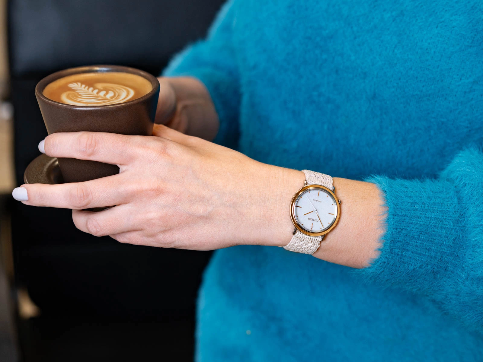 Ten model stworzono z myślą o kobiecie, która ceni elegancję nie w jej oczywistej, ostentacyjnej formie, lecz w subtelności gestu i jakości wykonania. Pasek z beżowej tkaniny, o delikatnej strukturze i miękkim dotyku, idealnie dopasowuje się do nadgarstka, zapewniając naturalny komfort noszenia. Do zestawu dołączono dodatkową bransoletę typu mesh w kolorze srebrnym wykonaną ze stali szlachetnej, której nowoczesna, lekko biżuteryjna forma nadaje zegarkowi zupełnie nowego charakteru.