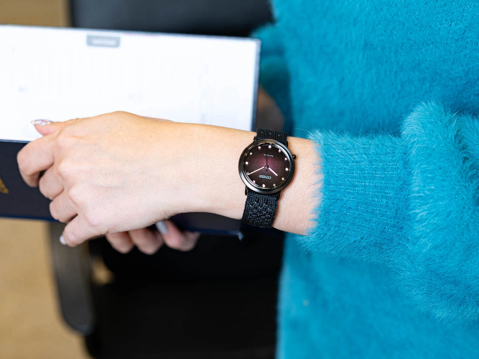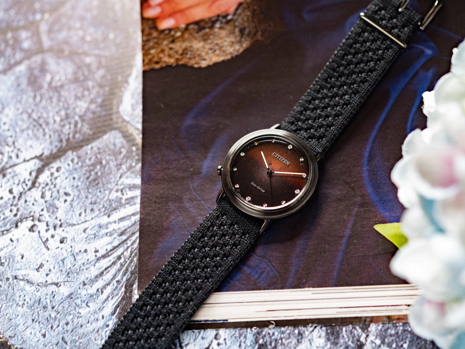 Citizen EM1007-47E Eco-Drive Citizen L Set to zegarek, który w subtelny sposób łączy elegancję z nowoczesnym charakterem, stanowiąc wyjątkowy akcent w kobiecej garderobie. Wywodzący się z ekskluzywnej kolekcji Citizen L Set, model ten reprezentuje filozofię harmonii między klasyką a innowacyjnym podejściem do zegarmistrzostwa. Dwukolorowa kompozycja zegarka tworzy mocny, ale subtelny kontrast. Czarna koperta w połączeniu z materiałowym paskiem zapinanym na klasyczna sprzączkę, a zarazem nowoczesny charakter. Czerwona tarcza, o intensywnym, głębokim odcieniu, przyciąga wzrok i wprowadza w całość dynamiczny akcent, podkreślając wyjątkowość tego modelu. Kontrastujące wskazówki i indeksy w postaci drobnych kryształków harmonizują z wyrazistą tarczą, zapewniając czytelność. Cyferblat zabezpiecza płaskie szkło szafirowe.