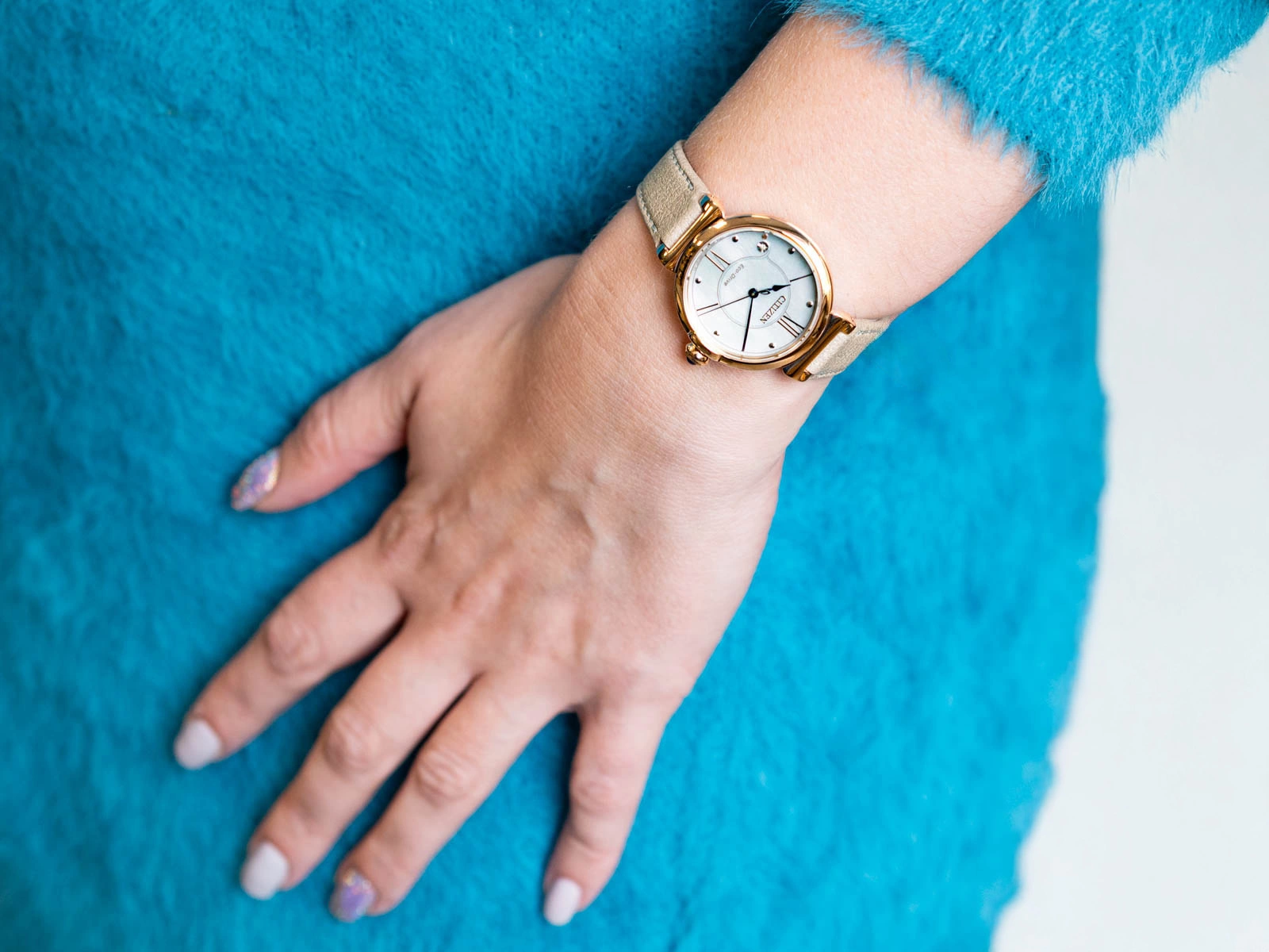 Tarcza, wykonana z naturalnej masy perłowej, ujawnia unikalną grę refleksów świetlnych, zmieniających się w zależności od kąta patrzenia. Jej organiczna struktura wprowadza do projektu pierwiastek naturalnego piękna, przywodząc na myśl delikatność płatków konwalii majowej – kwiatu, który stał się motywem przewodnim kolekcji. W górnej części tarczy osadzono diament, umieszczony asymetrycznie przy godzinie ósmej, który symbolizuje kroplę rosy spoczywającą na płatku kwiatu. To detal o symbolicznym znaczeniu, a zarazem element, który nadaje kompozycji biżuteryjnego wymiaru. Całość uzupełniają indeksy w tonacji różowego złota, oraz niebieskie wskazówki których geometryczna precyzja kontrastuje z organiczną strukturą tarczy. Dzięki takiemu zestawieniu projekt zachowuje równowagę między naturalnością a nowoczesną elegancją. Zegarek wyposażono w szafirowe szkło, które gwarantuje wysoką odporność na zarysowania i zapewnia doskonałą czytelność tarczy w każdych warunkach. Skórzany pasek w beżowym odcieniu został starannie dopasowany kolorystycznie do kompozycji koperty, tworząc subtelne, spójne zestawienie. Miękka struktura skóry ekologicznej zapewnia wysoki komfort użytkowania i doskonałe dopasowanie do nadgarstka. Zastosowane zapięcie motylkowe zapewnia pewne osadzenie zegarka na nadgarstku.