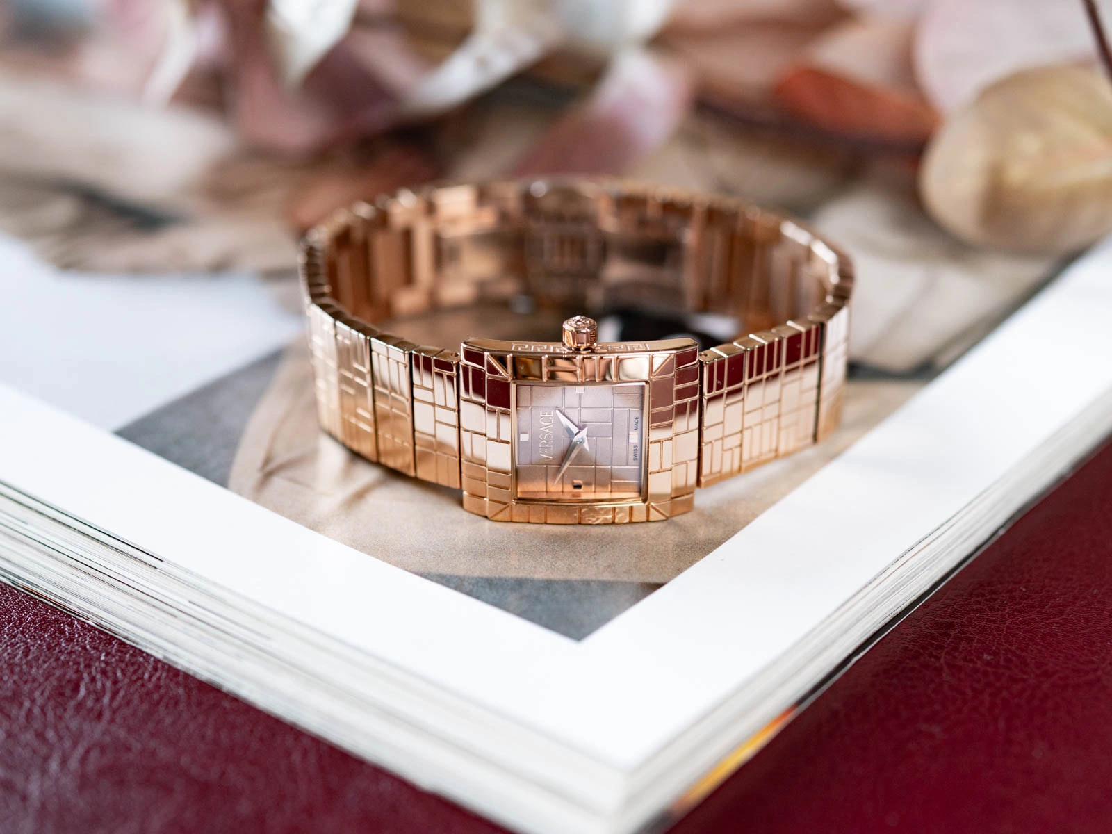 Versace VE9B00224 Mosaic to kwintesencja kobiecej elegancji i nowoczesnego stylu. Ten wyjątkowy model zachwyca subtelnym blaskiem różowego złota oraz oryginalnym wzorem inspirowanym klasyczną mozaiką, który harmonijnie łączy tradycję z nowoczesnością. Prostokątna koperta wykonana z wysokiej jakości stali szlachetnej nadaje całości wysublimowanego charakteru, podkreślając indywidualny styl właścicielki. W sercu zegarka pracuje precyzyjny, szwajcarski mechanizm kwarcowy - symbol niezawodności i dokładności, potwierdzony prestiżowym oznaczeniem Swiss Made. Tarcza chroniona jest szkłem szafirowym, odpornym na zarysowania i wpływ codziennego użytkowania, co gwarantuje niezmienny blask przez lata.