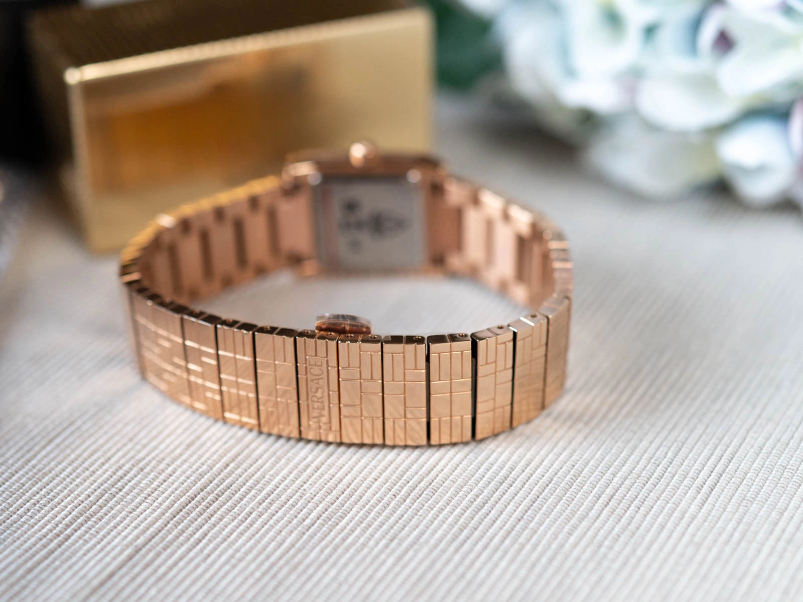 - Zegarek Damski Versace VE9B00224 różowe złoto na bransolecie.
