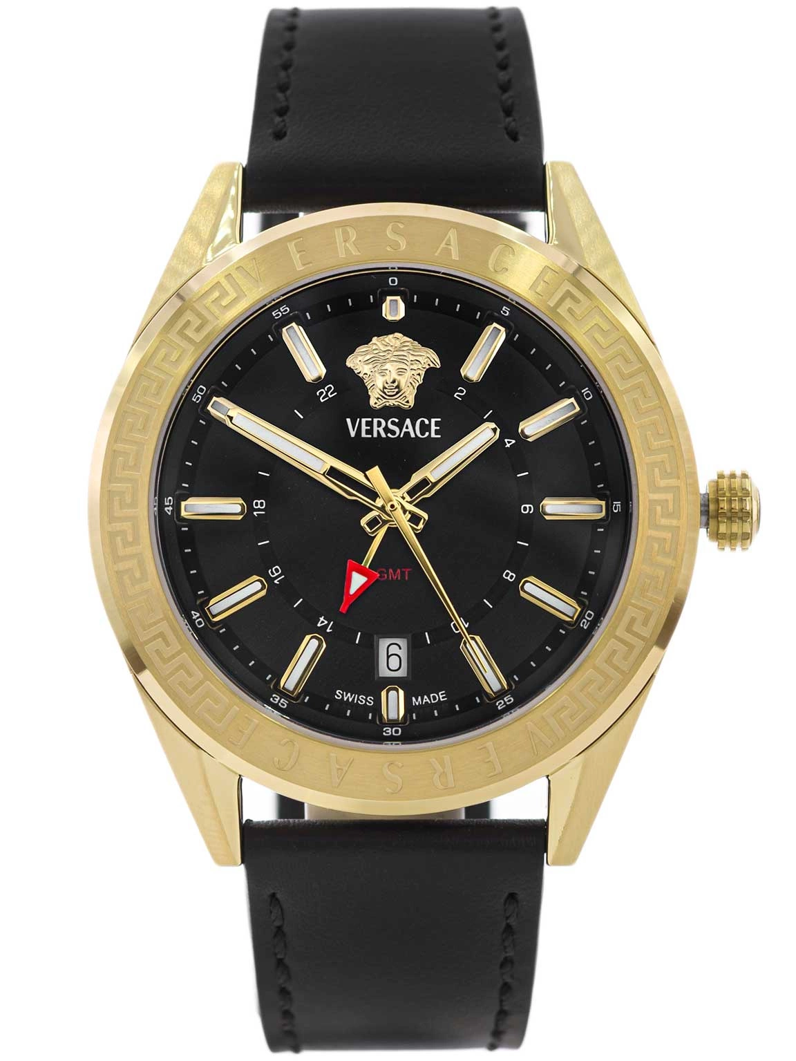 VERSACE VEAFA0224 V-Code GMT to esencja męskiej elegancji w nowoczesnym wydaniu. Połączenie kunsztu zegarmistrzowskiego, włoskiego designu i szwajcarskiej precyzji. Model ten przyciąga uwagę wyrazistą kompozycją, głęboka czerń tarczy i skórzanego paska została zestawiona z blaskiem złotej koperty, tworząc harmonijny kontrast o wyjątkowo luksusowym charakterze. Złota głowa Meduzy, kultowy symbol marki Versace, umieszczony jest na pozycji godziny dwunastej. Otaczają ją smukłe, złote indeksy oraz precyzyjne wskazówki, które łączą elegancję z doskonałą czytelnością. Dodatkowa wskazówka GMT umożliwia jednoczesne odczytanie czasu w dwóch strefach, to funkcja stworzona z myślą o podróżnikach i osobach żyjących w rytmie międzynarodowych spotkań. Datownik na godzinie szóstej subtelnie dopełnia projekt, zachowując jego wizualną równowagę.