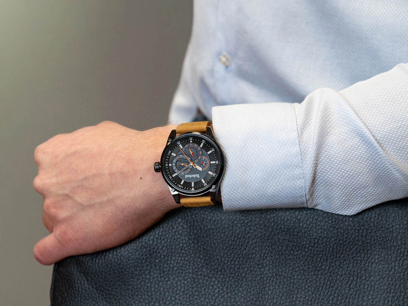 Timberland TDWGF9000902 to wyraz męskiej elegancji w nowoczesnym, surowym wydaniu, które odzwierciedla charakter marki inspirowanej naturą i wytrzymałością. Jego czarna, metalowa koperta o matowym wykończeniu otacza tarczę utrzymaną w tej samej tonacji, tworząc spójną, minimalistyczną kompozycję. Głębia czerni została przełamana subtelnymi detalami i białymi indeksami, które podkreślają czytelność i nadają całości zdecydowany, klasyczny rytm. Zegarek zawieszono na brązowym pasku z naturalnej skóry, zapinanym na tradycyjną sprzączkę – miękkim, wygodnym i z czasem nabierającym indywidualnego charakteru. W centrum kompozycji znajduje się zestaw trzech mniejszych tarcz, które tworzą rozbudowany datownik. Pokazują one dzień tygodnia, dzień miesiąca oraz czas w formacie 24-godzinnym, łącząc estetykę z funkcjonalnością. Wskazówki pokryto warstwą luminescencyjnej powłoki neobrite, dzięki której pozostają widoczne również po zmroku, emitując delikatne światło po wcześniejszym naświetleniu. Całość chroni płaskie szkło mineralne a sercem zegarka jest precyzyjny mechanizm kwarcowy, gwarantujący niezawodne działanie przez długi czas. Timberland TDWGF9000902 to model, w którym surowość czerni spotyka się z ciepłem naturalnej skóry, tworząc wyjątkowy balans pomiędzy nowoczesnością a klasyką. Jego uniwersalny charakter sprawia, że doskonale sprawdzi się zarówno w miejskim rytmie dnia, jak i w bardziej formalnych sytuacjach. Oferowany w eleganckim pudełku Timberland, stanowi nie tylko narzędzie odmierzające czas, lecz także jako doskonały pomysł na prezent.