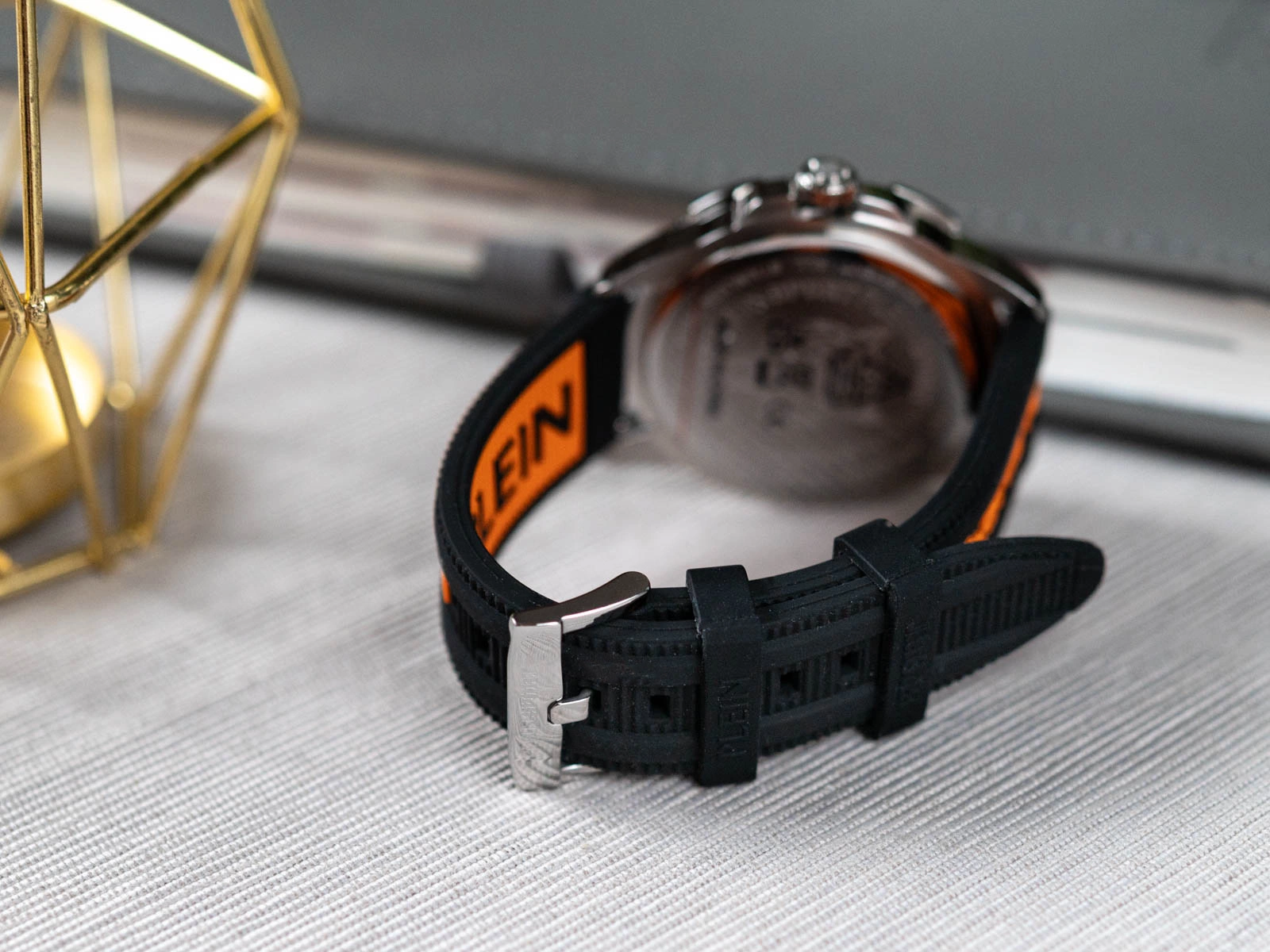 Zegarek Plein Sport PSGDA0324 Rampage to dynamiczna interpretacja sportowej elegancji, w której klasyczna forma spotyka się z odważnym kolorem. Srebrna koperta wykonana ze stali szlachetnej stanowi solidną podstawę kompozycji, podczas gdy czarny silikonowy pasek z pomarańczowymi akcentami nadaje całości energicznego, nowoczesnego charakteru. Czarna tarcza, ozdobiona subtelną fakturą i niewielkim logo Plein Sport, przyciąga uwagę kontrastującymi pomarańczowymi detalami, które podkreślają sportowy temperament zegarka. Srebrno-białe indeksy liniowe pokryte powłoką neobrite gwarantują po wcześniejszym naświetleniu doskonałą czytelność, także w słabszym oświetleniu. Datownik wskazujący dzień miesiąca został wkomponowany w projekt tarczy z typową dla marki precyzją i wyczuciem estetyki. Całość chroni płaskie szkiełko mineralne, które zapewnia trwałość i odporność na zarysowania. Za dokładność wskazań odpowiada japoński mechanizm kwarcowy Seiko TMI VJ52B11T, łączący niezawodność i funkcjonalność z charakterystycznym dla marki Plein Sport duchem nowoczesności. Plein Sport PSGDA0324 Rampage to połączenie siły, dynamiki i stylu – zegarek dla osób, które wybierają energię i pewność siebie w każdym detalu. Zapakowany w oryginalne pudełko producenta, będzie stanowił doskonały pomysł na prezent.